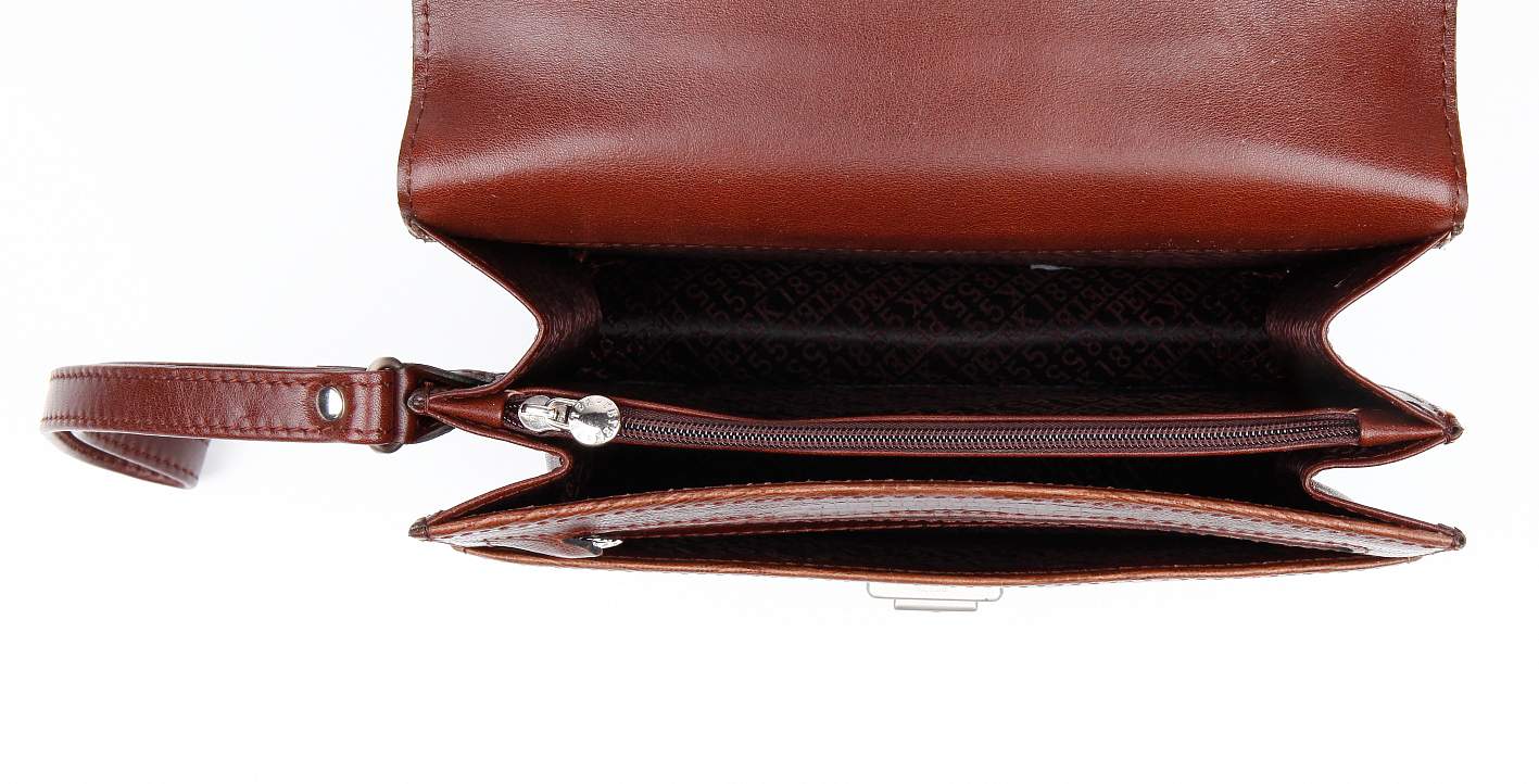 Мужская сумка-визитка Petek из натуральной кожи. Плечевой ремень; снаружи - на задней стенке располагается карман на замке "молния", передняя стенка раскрывается планшетом - прозрачное окошко, отдел для сотового телефона, объемный карман.