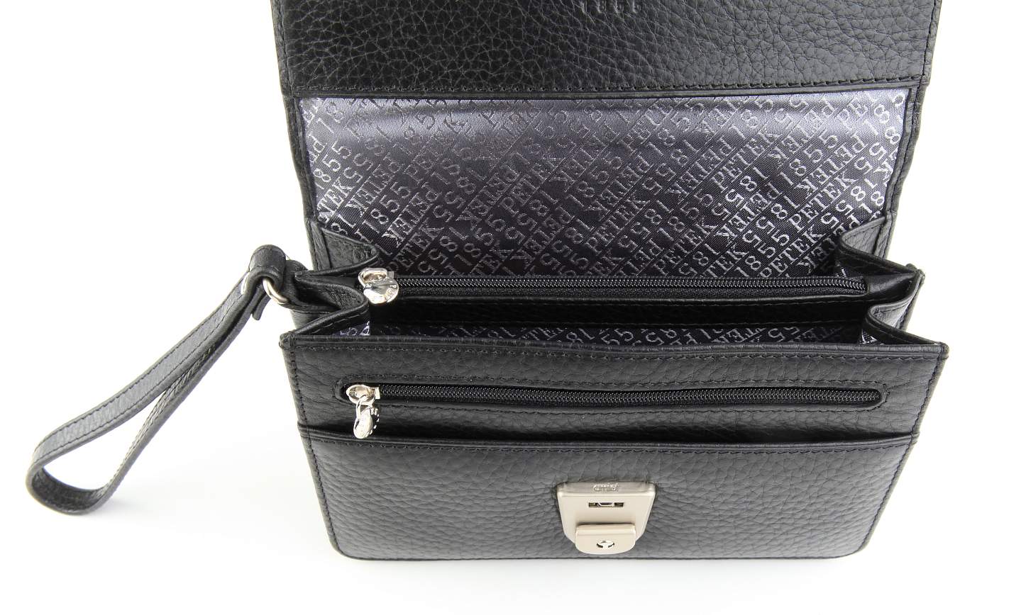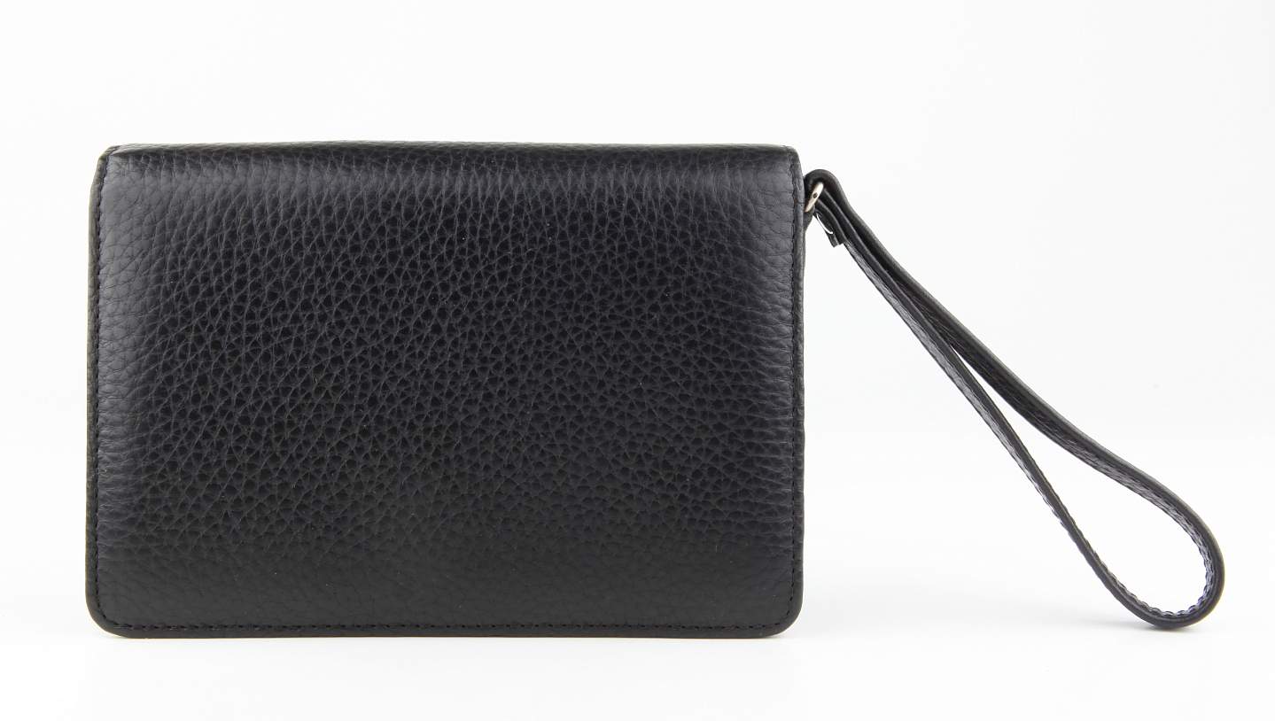 Визитка. Замок фирмы AMIET (закрывается на ключ), ремешок на запястье. Внутри: два больших отдела для документов, между которыми отделение на молнии. Снаружи, на передней стенке: два кармана для документов (один из них на молнии).