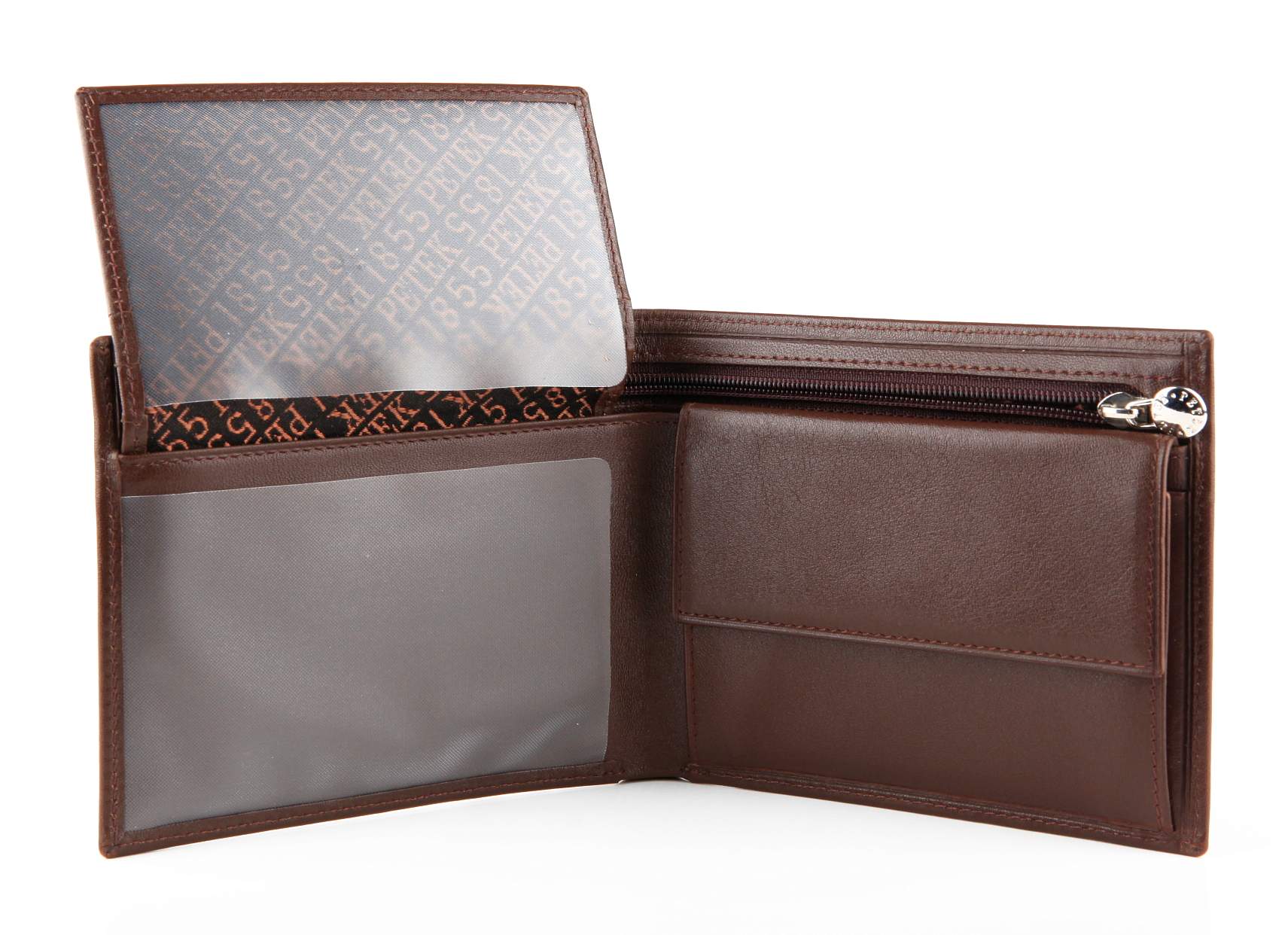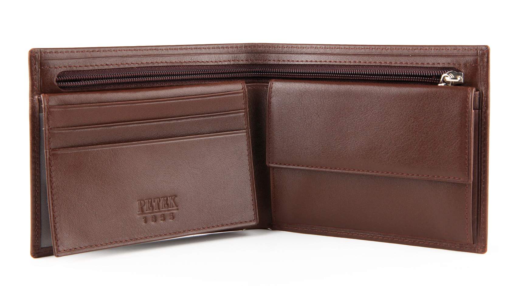 Мужское кожаное портмоне Petek. Эта удобная и многофункциональная модель выполнена из натуральной кожи и состоит из 2 отделений для купюр(одно из них на молнии) 3 карманов для кредиток, два окошка-сеточки, отделение для мелочи.
