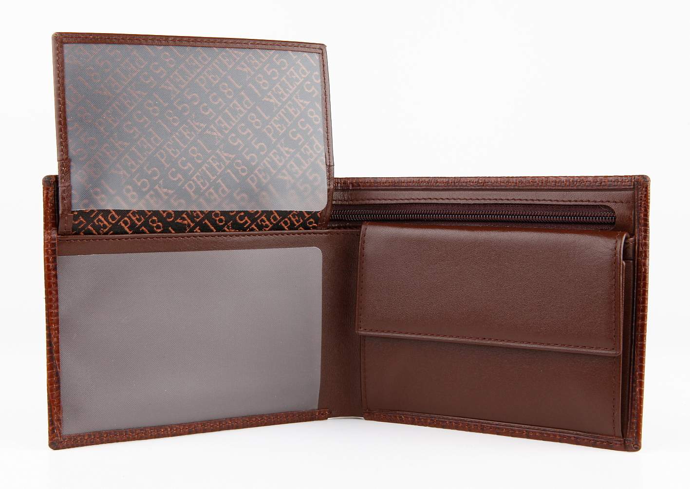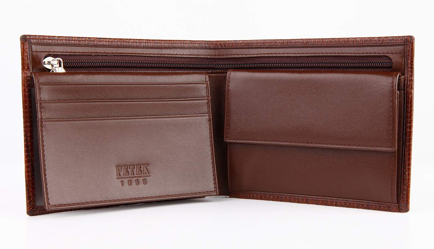 Мужское кожаное портмоне Petek. Эта удобная и многофункциональная модель выполнена из натуральной кожи и состоит из 2 отделений для купюр(одно из них на молнии) 3 карманов для кредиток, два окошка-сеточки, отделение для мелочи.
