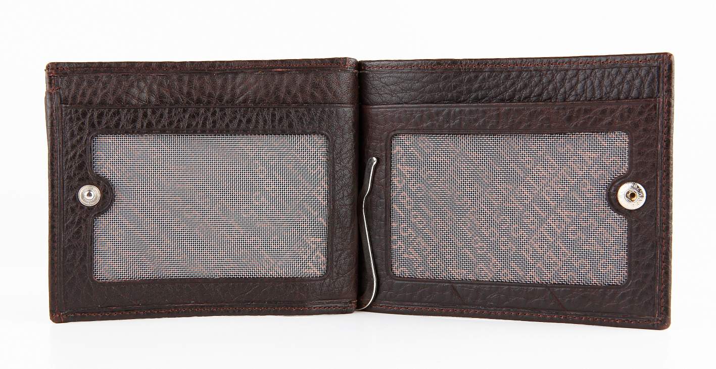 Мужской компактный и стильный зажим для купюр Petek из натуральной кожи . Внутри два окошка-сеточки (7х10 см), снаружи отделение для мелочи.