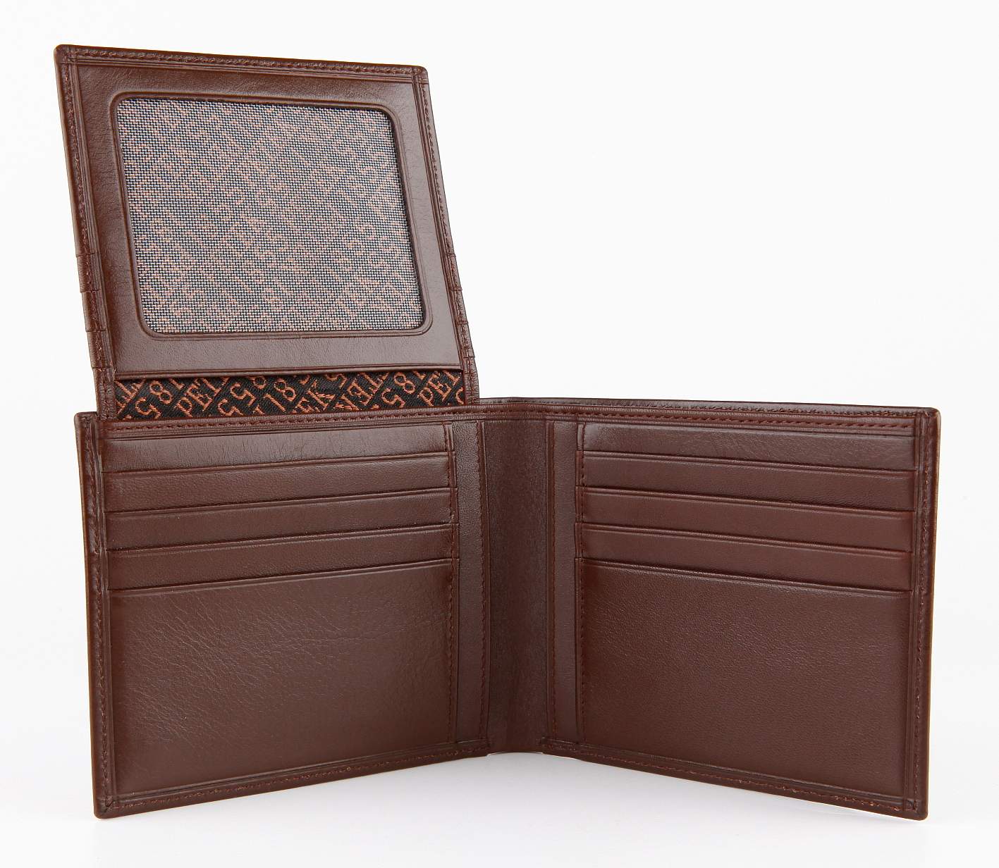 Стильное классическое портмоне PETEK из натуральной кожи. Модель состоит из 2 отделений для купюр, прозрачного окошка, 4 боковых карманов, 12 отделений для визитных или пластиковых карт.