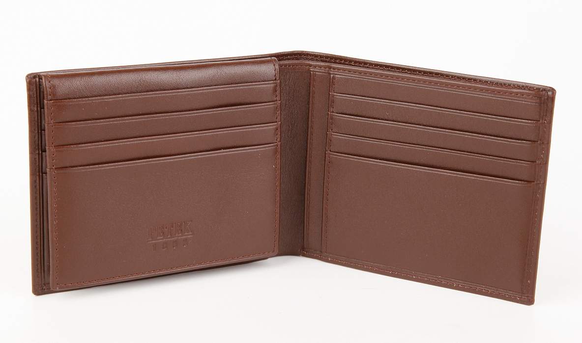 Стильное классическое портмоне PETEK из натуральной кожи. Модель состоит из 2 отделений для купюр, прозрачного окошка, 4 боковых карманов, 12 отделений для визитных или пластиковых карт.