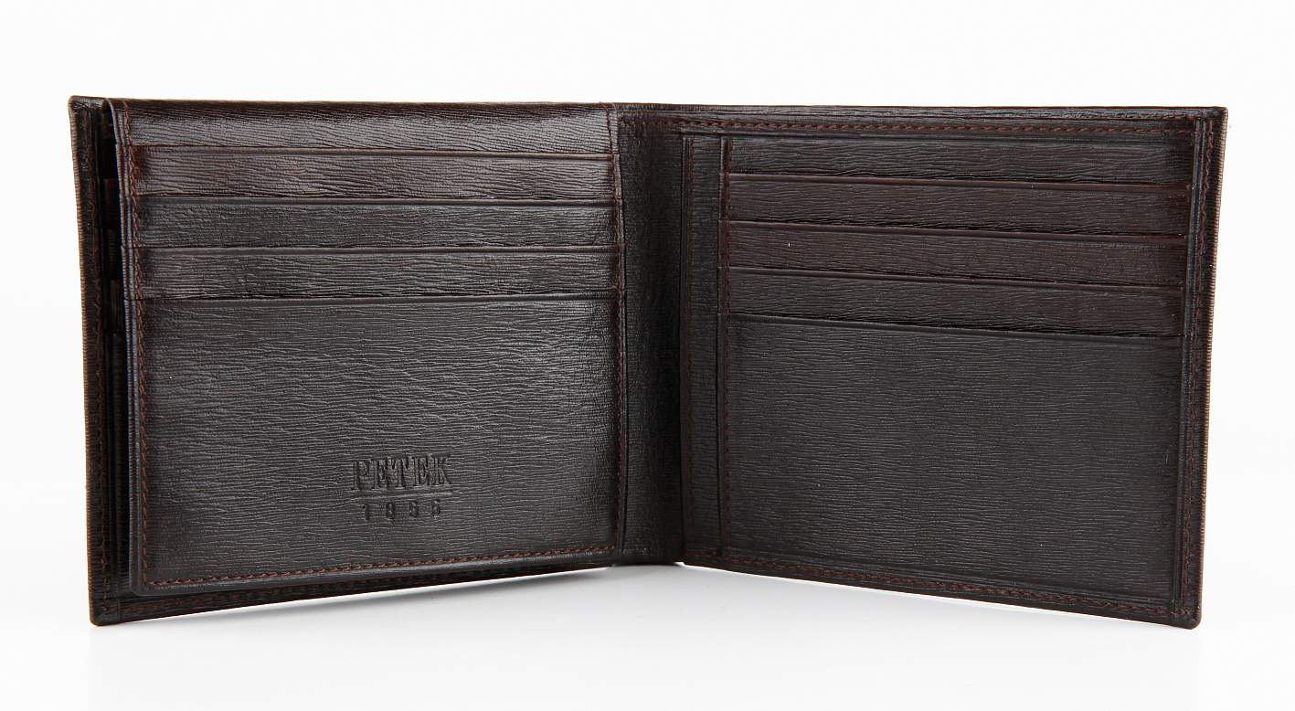 Стильное классическое портмоне PETEK из натуральной кожи. Модель состоит из 2 отделений для купюр, прозрачного окошка, 4 боковых карманов, 12 отделений для визитных или пластиковых карт.