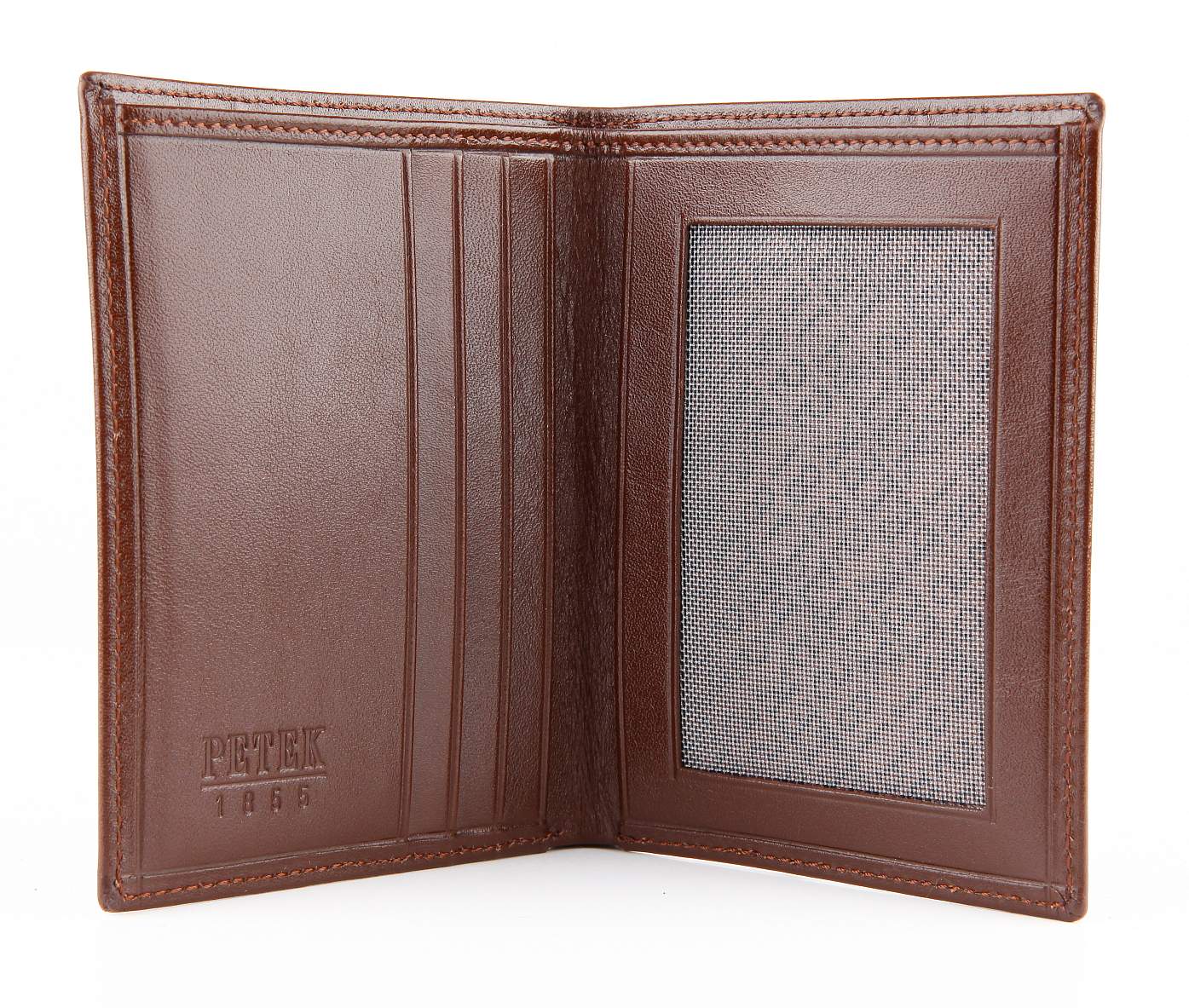 Мужское кожаное портмоне PETEK . Закрывается без застежки. 2 отделения для купюр. 4 отделений для визитных и кредитных карт. 1 прозрачное отделение с сеткой для документов.
