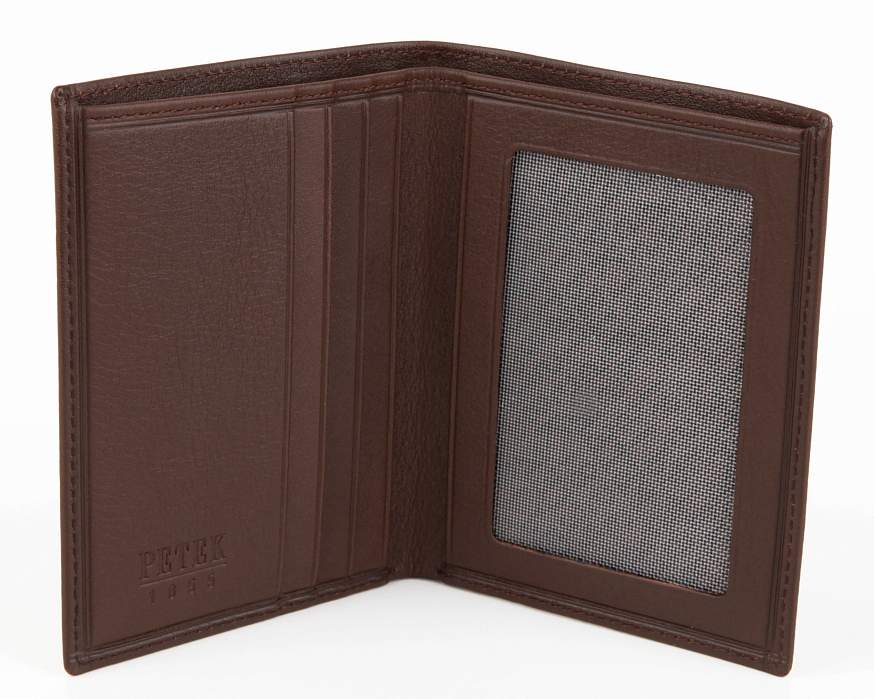 Мужское кожаное портмоне PETEK . Закрывается без застежки. 2 отделения для купюр. 4 отделений для визитных и кредитных карт. 1 прозрачное отделение с сеткой для документов.
