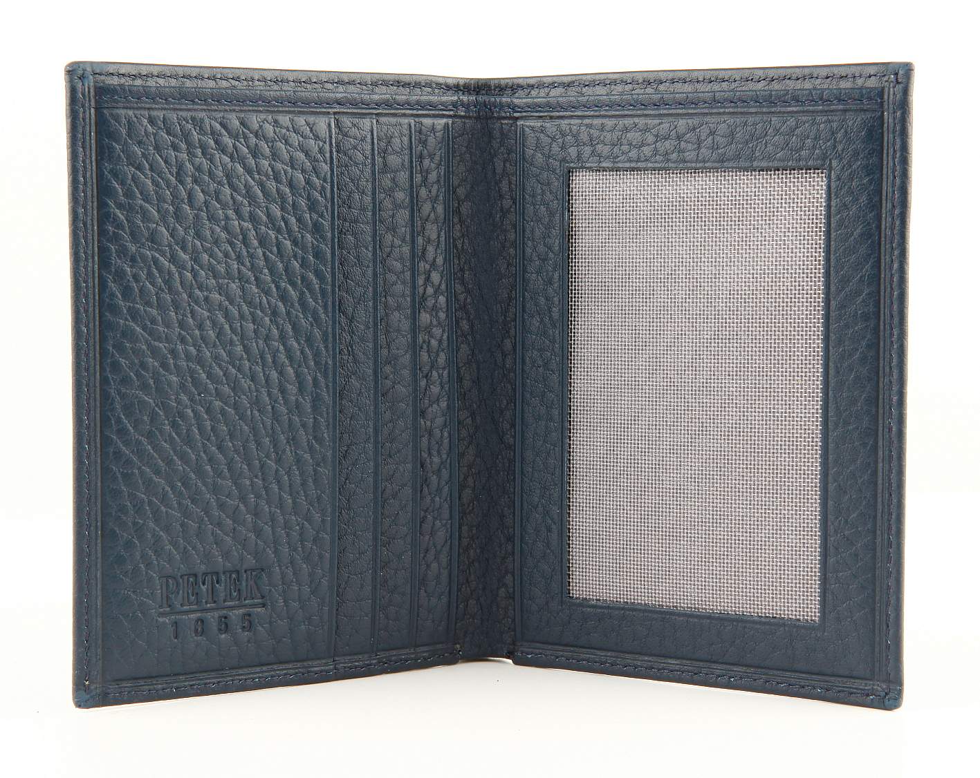Мужское кожаное портмоне PETEK . Закрывается без застежки. 2 отделения для купюр. 4 отделений для визитных и кредитных карт. 1 прозрачное отделение с сеткой для документов.