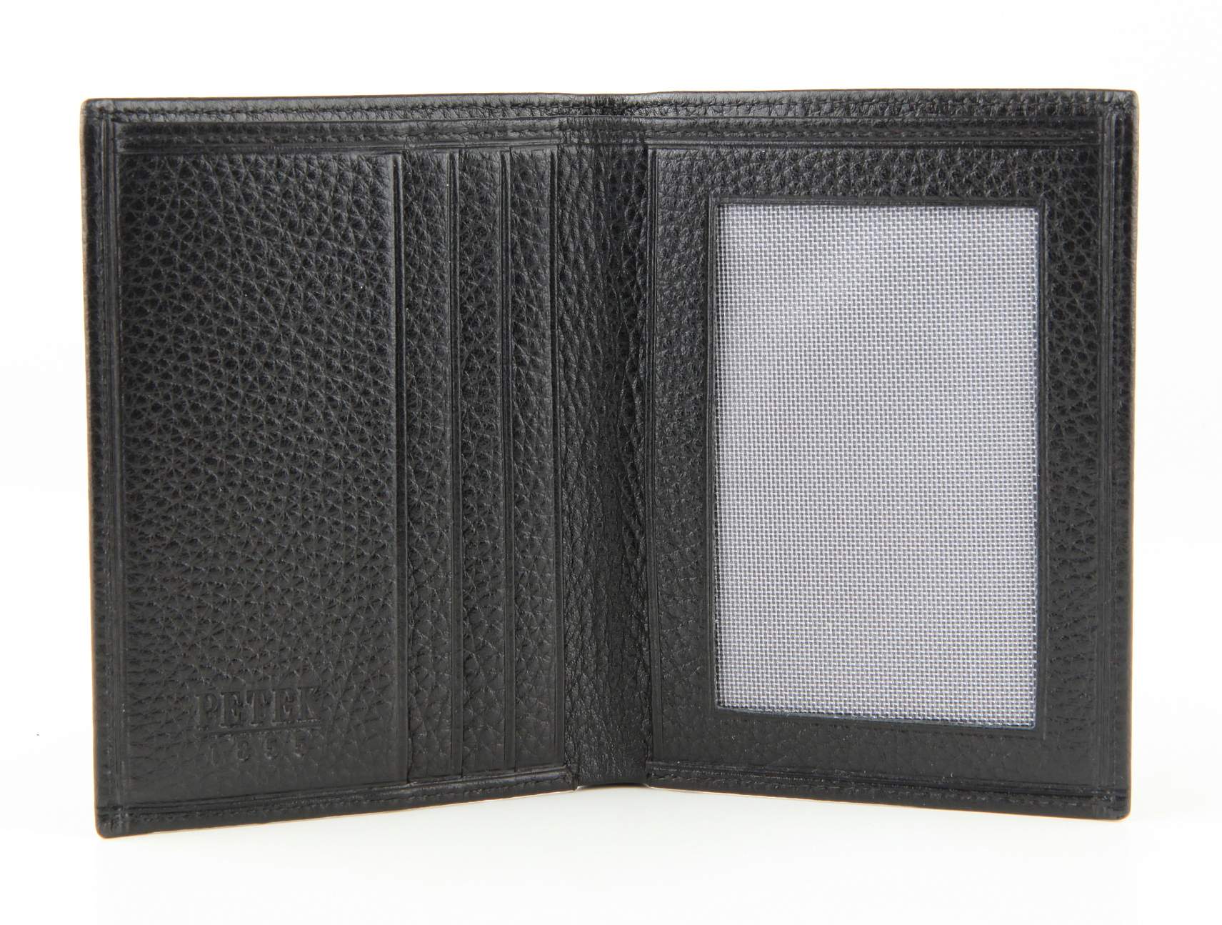 Мужское кожаное портмоне PETEK . Закрывается без застежки. 2 отделения для купюр. 4 отделений для визитных и кредитных карт. 1 прозрачное отделение с сеткой для документов.
