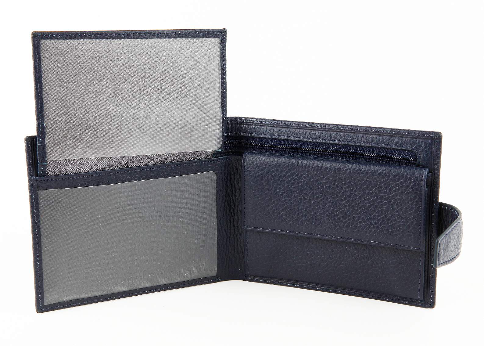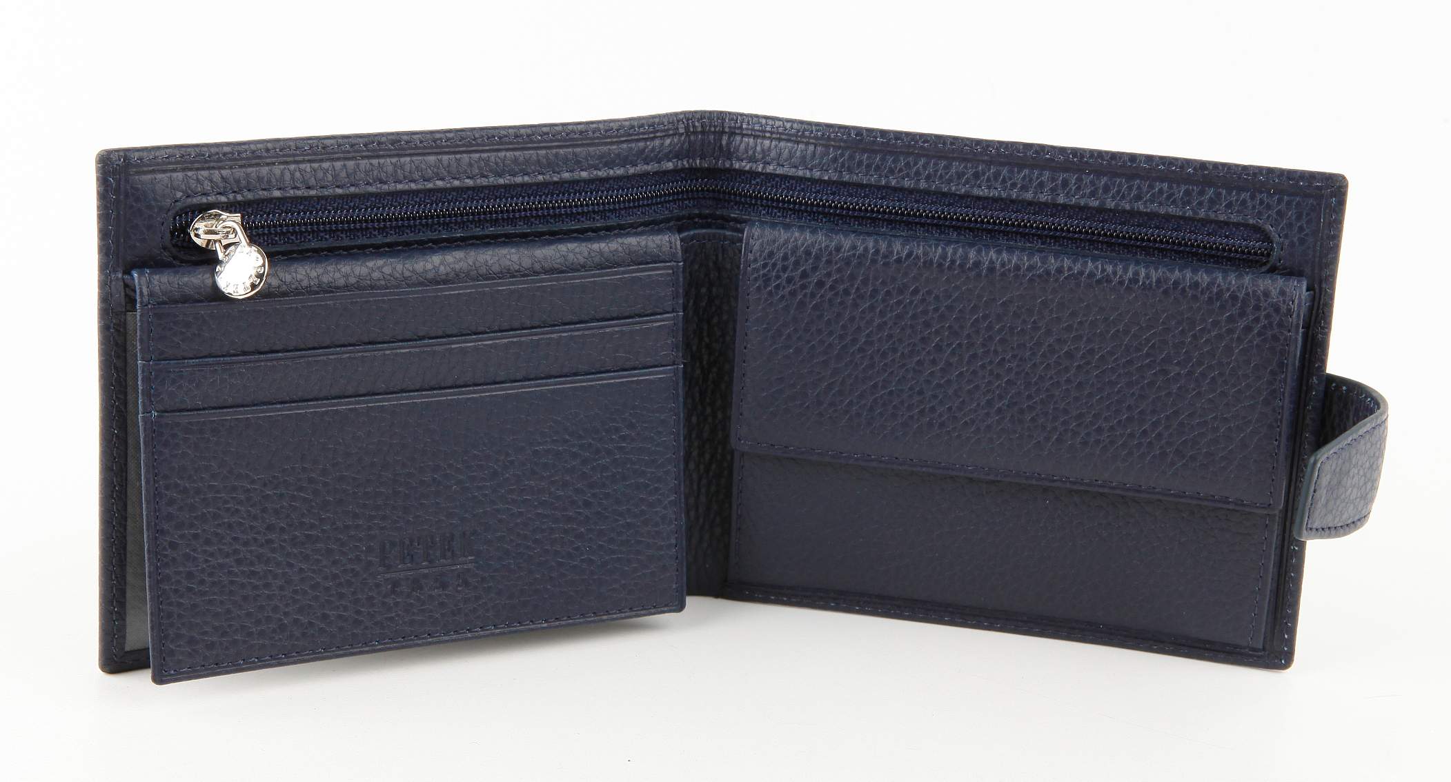 Классическое мужское портмоне Petek. Внутри: отделение для купюр + отделение на молнии, три кармана для кредиток, два окошка-пластик, отделение для мелочи. Закрывается на хлястик с кнопкой.