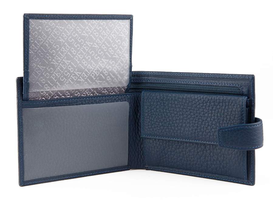 Классическое мужское портмоне Petek. Внутри: отделение для купюр + отделение на молнии, три кармана для кредиток, два окошка-пластик, отделение для мелочи. Закрывается на хлястик с кнопкой.