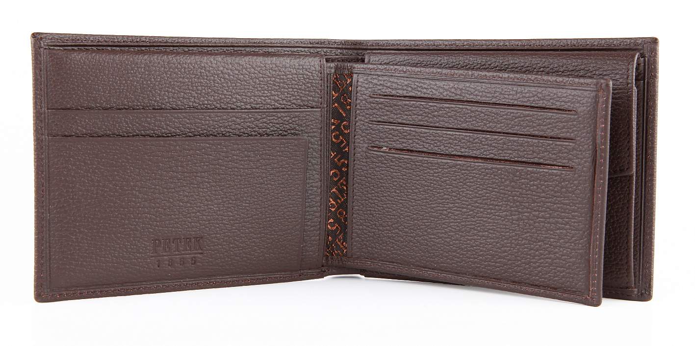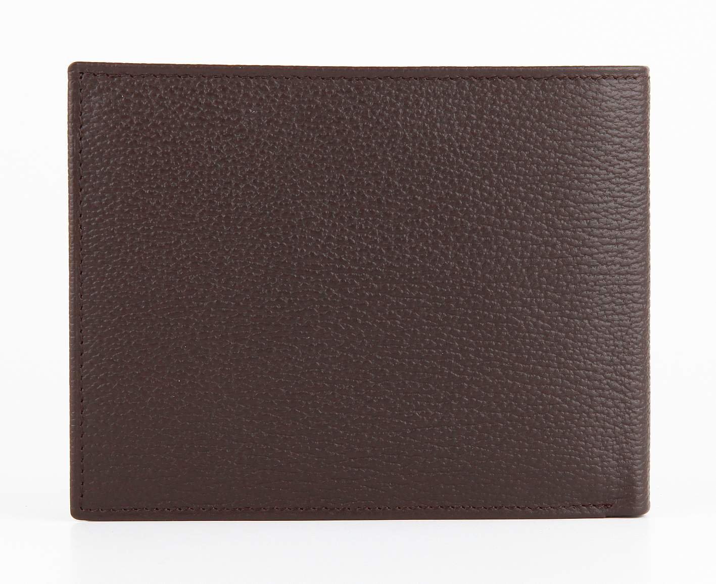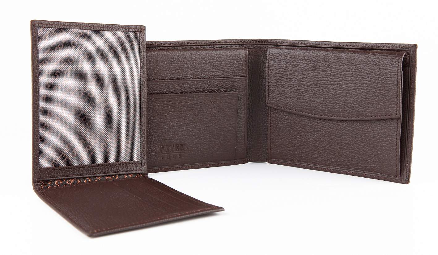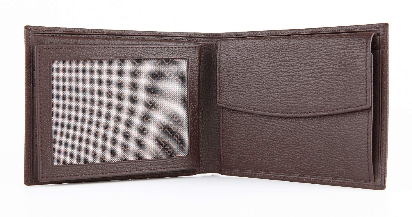 Портмоне из натуральной кожи. Раскладывается пополам горизонтально, внутри: два отдела для купюр, отделение для мелочи, карман для бумаг, угловой отгибающийся кармашек для документа (пропуска) дополнительно: вкладыш, внутри которого два кармана для документов.