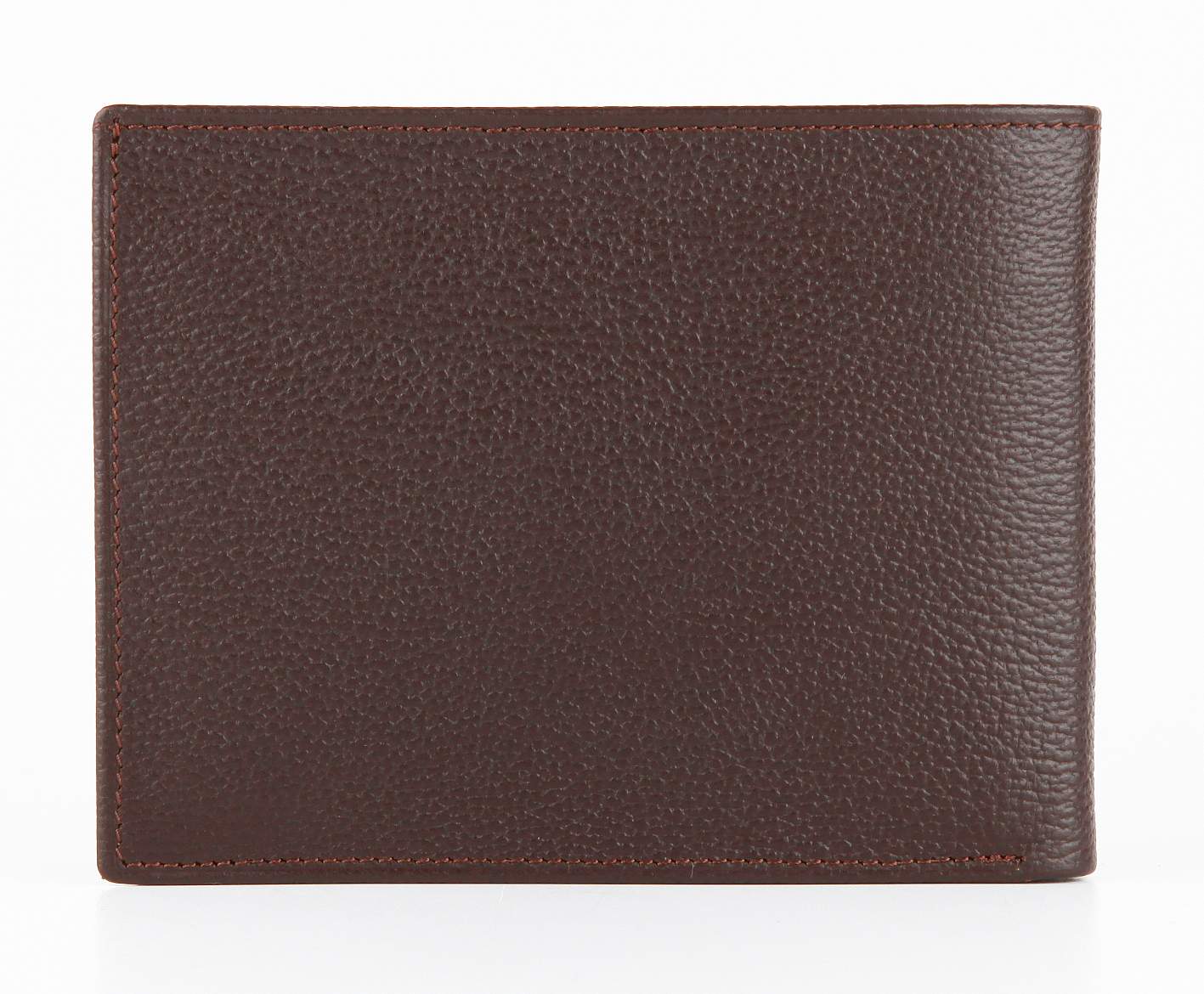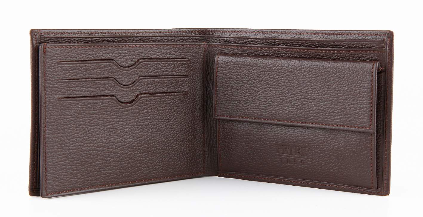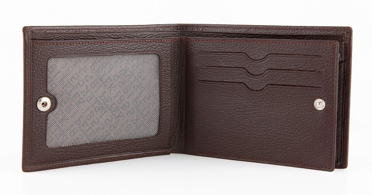 Портмоне из высококачественной натуральной кожи. Раскладывается пополам внутри: два отдела для купюр, отделение для мелочи, два потайных кармана для документов, карман для пропуска или фотографии (с прозрачной пластиковой вставкой), шесть кармашков для пластиковых карт.