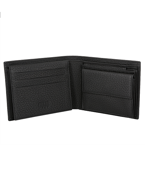 Портмоне изготовлено из натуральной кожи, которая обеспечивает долговечность и привлекательный внешний вид аксессуара. Внутри портмоне расположено 6 карманов для визитных карточек и кредитных карт, 1 из которых имеет прозрачное окошко из пластика. Для монет предусмотрен “конверт” с потайным карманом, который закрывается на кнопку. 3 отделения для купюр одно из них на молнии.