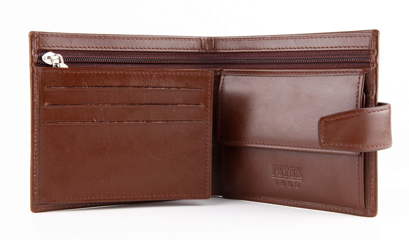 Мужское портмоне из натуральной кожи. Удобная классическая модель. Внутри: два отделения для купюр, один на молнии, монетница, один боковой карман, два прозрачных окошка, три отделения для визитных или пластиковых карт.
