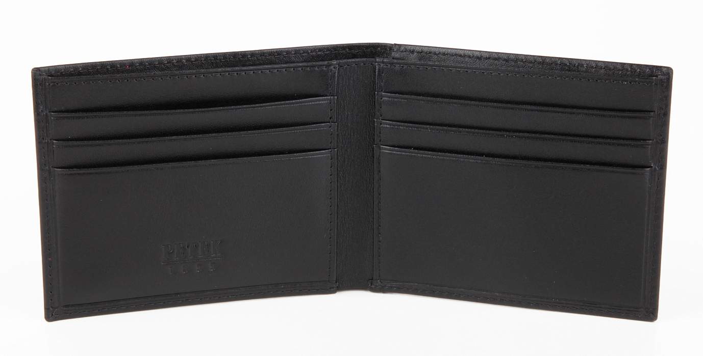Облегченное мужское портмоне Petek из натуральной кожи. Компактная и стильная модель. Внутри: одно отделение для купюр, шесть отделений для кредитных карт, три дополнительных кармана.