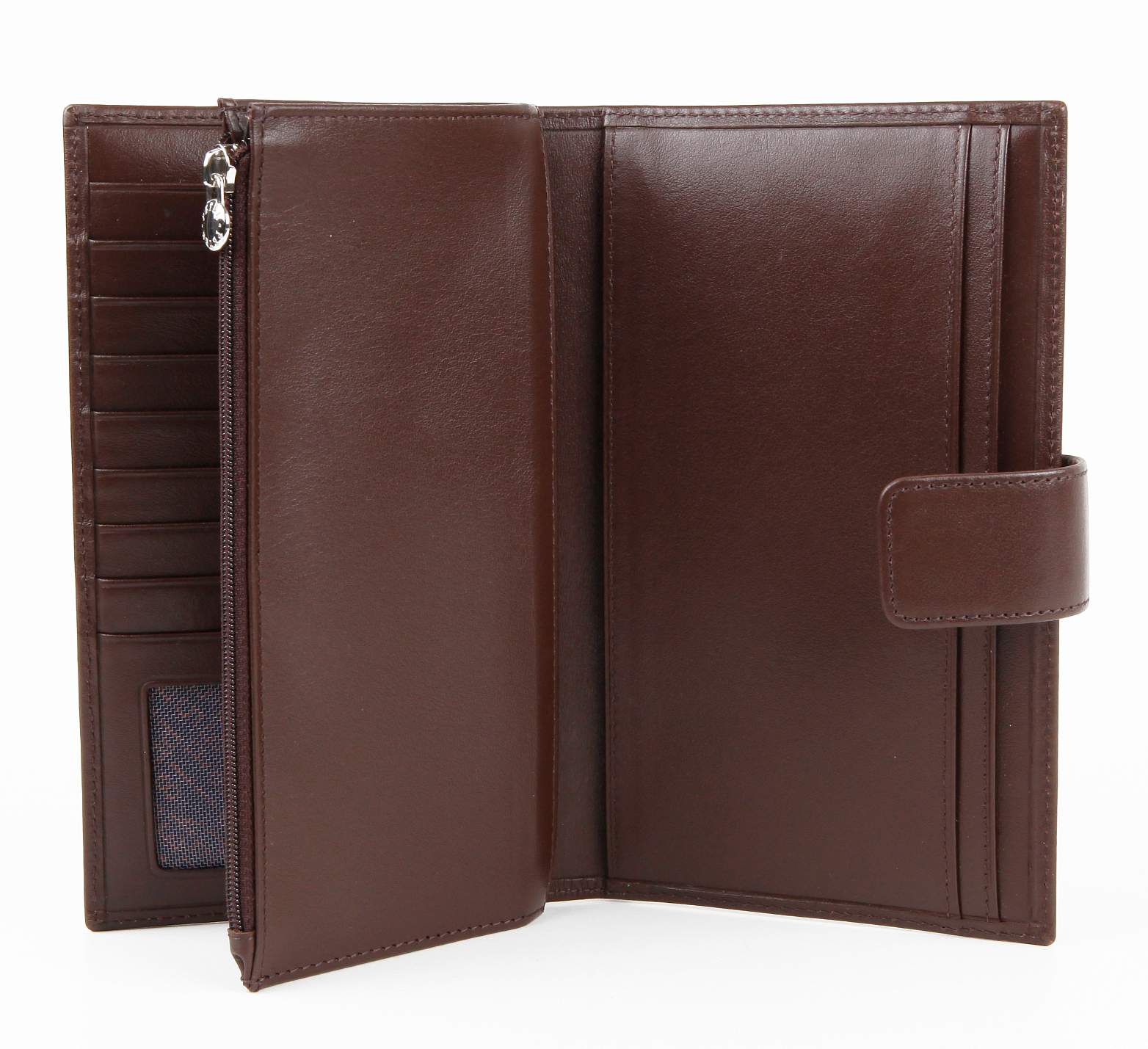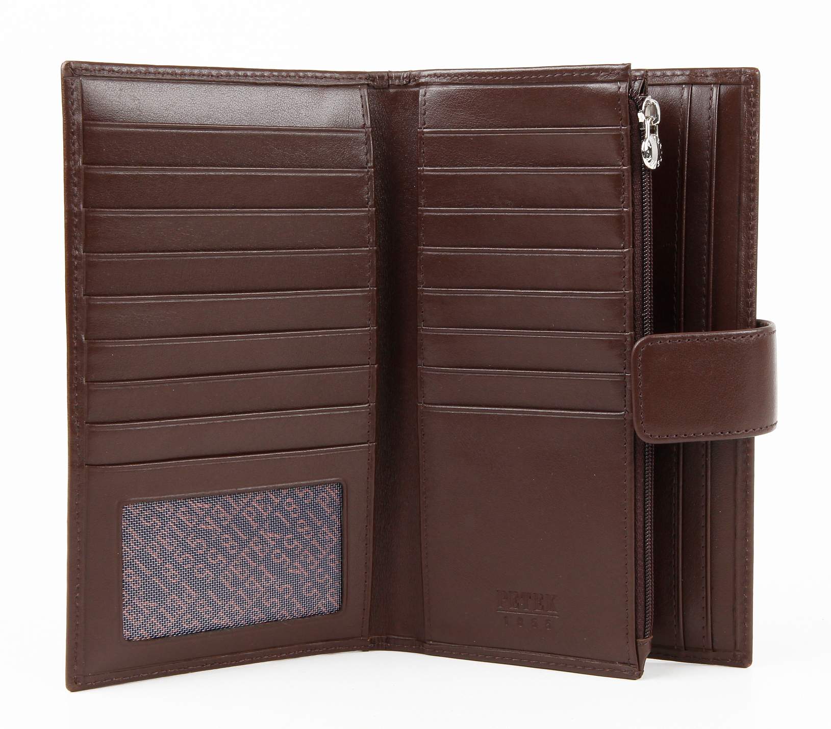 Современное удобное мужское портмоне Petek из натуральной кожи коричневого цвета.Внутри имеются четыре кармана для купюр, отделение на молнии, 17 карманов для кредитных карт.