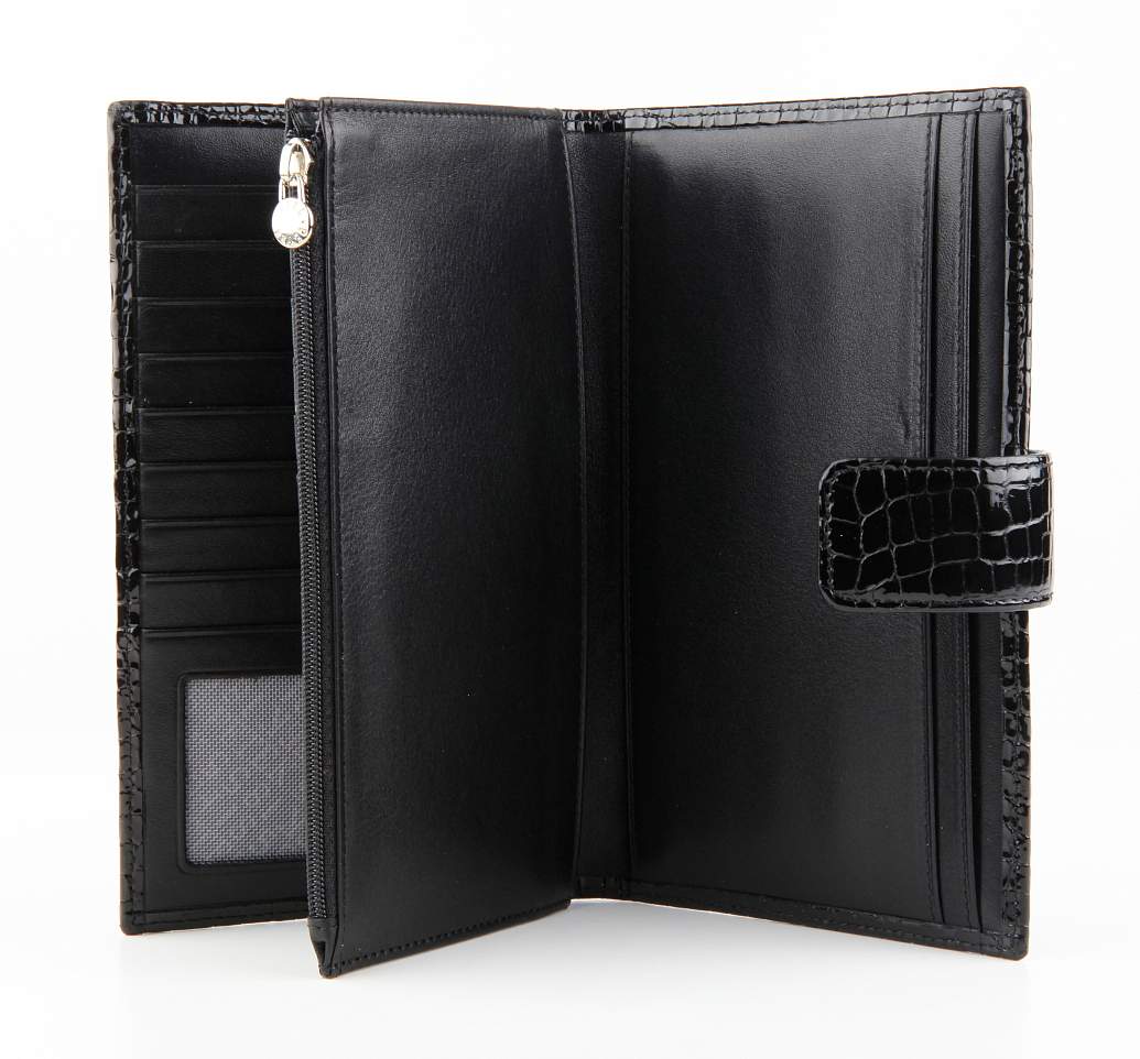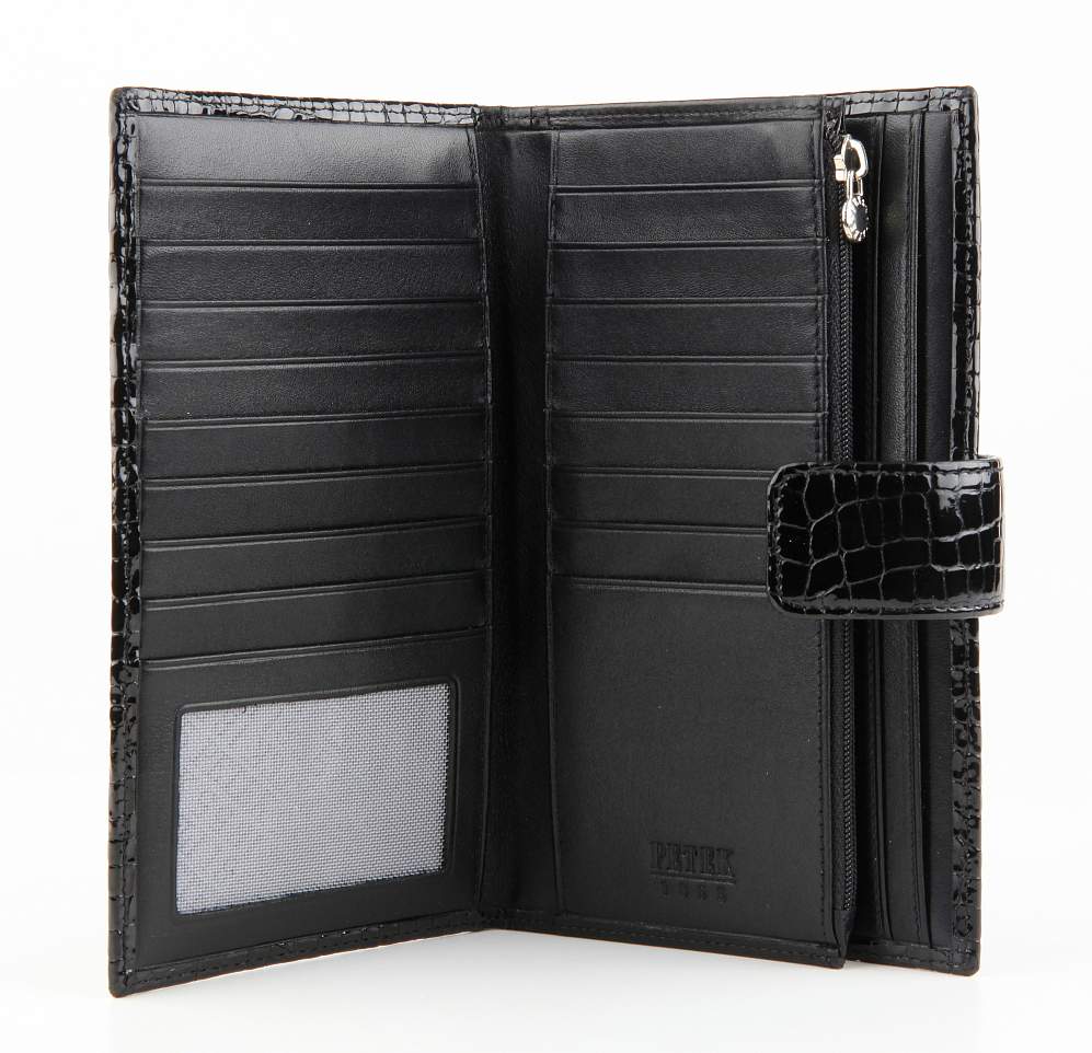 Современное удобное мужское портмоне Petek из натуральной кожи черного цвета с гладкой фактурой. Внутри имеются четыре кармана для купюр, отделение на молнии, 17 карманов для кредитных карт.