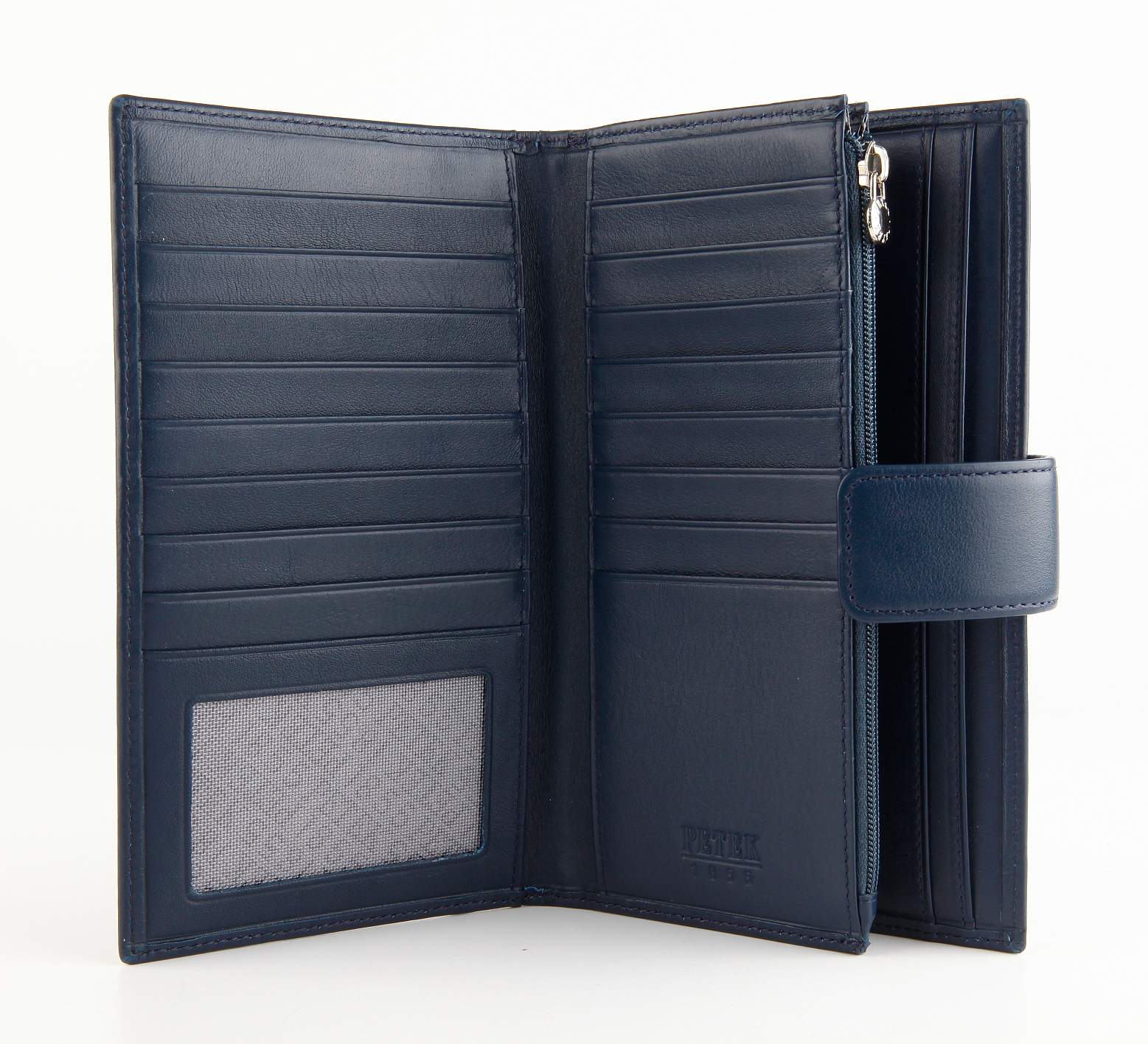Современное удобное мужское портмоне Petek из натуральной кожи черного цвета с гладкой фактурой. Внутри имеются четыре кармана для купюр, отделение на молнии, 17 карманов для кредитных карт.