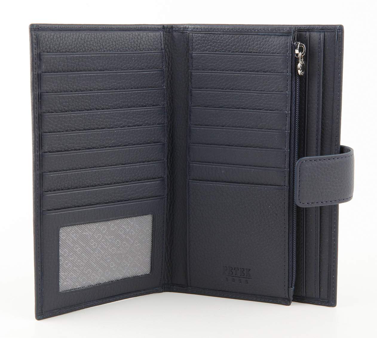 Современное удобное мужское портмоне Petek из натуральной кожи черного цвета с гладкой фактурой. Внутри имеются четыре кармана для купюр, отделение на молнии, 17 карманов для кредитных карт.