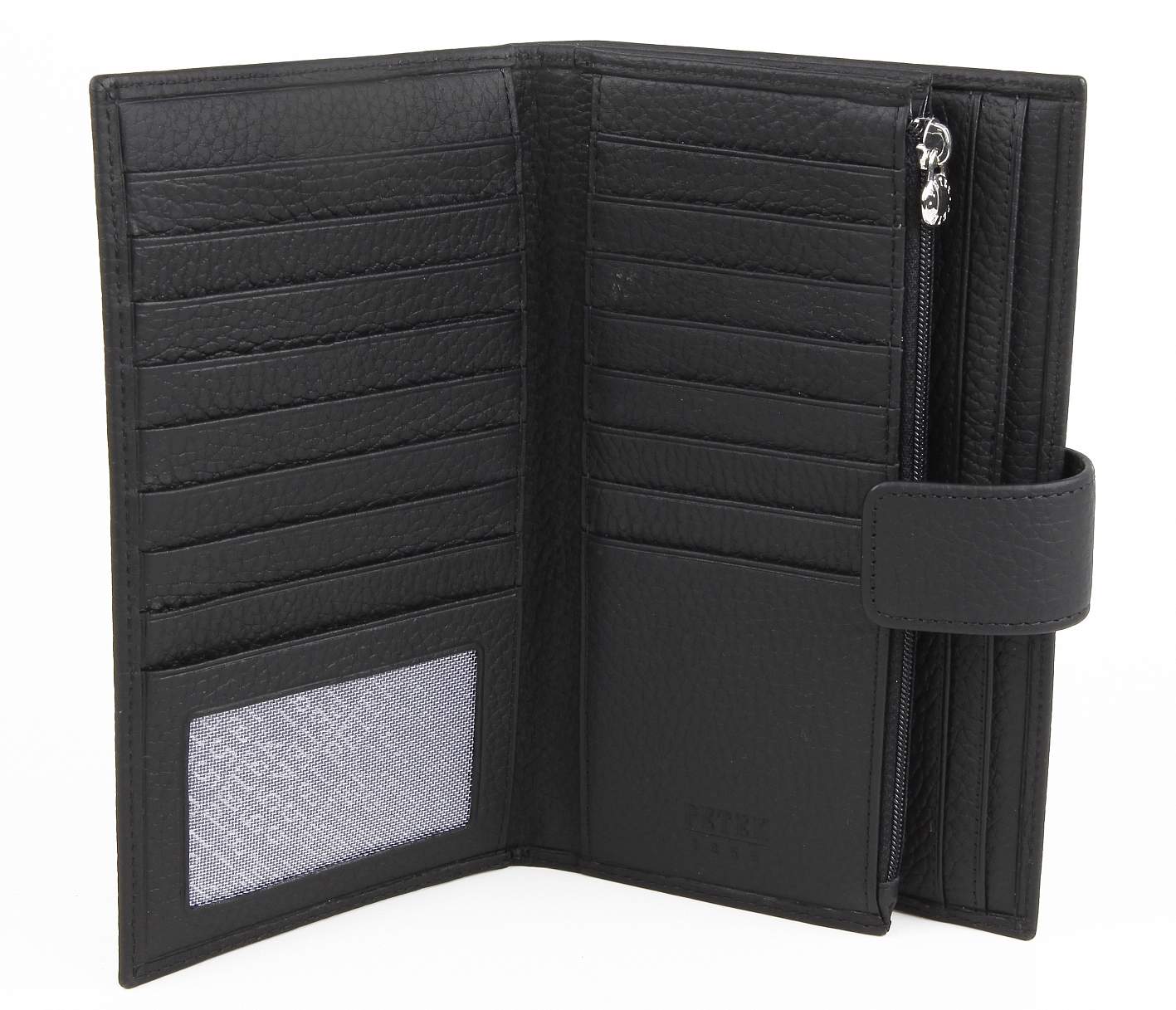 Современное удобное мужское портмоне Petek из натуральной кожи черного цвета с гладкой фактурой. Внутри имеются четыре кармана для купюр, отделение на молнии, 17 карманов для кредитных карт.