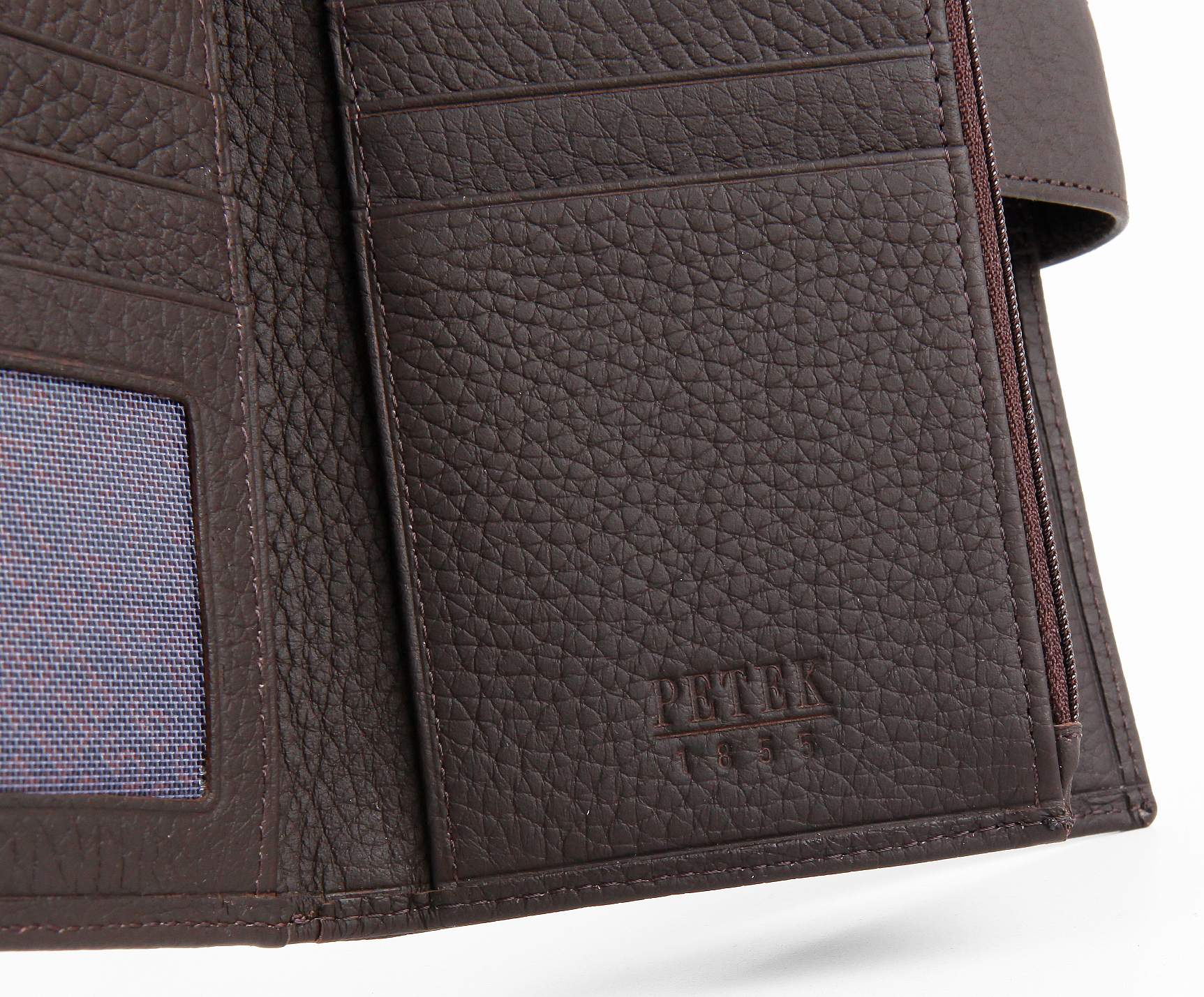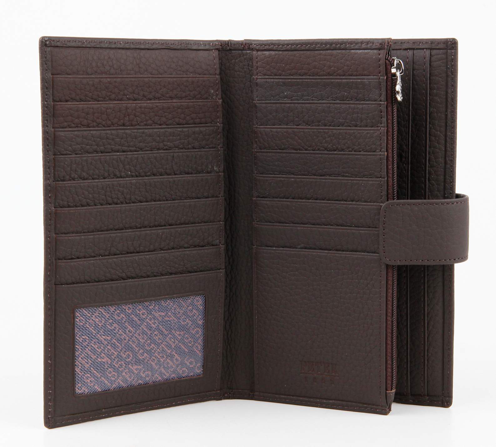 Современное удобное мужское портмоне Petek из натуральной кожи коричневого цвета.Внутри имеются четыре кармана для купюр, отделение на молнии, 17 карманов для кредитных карт.