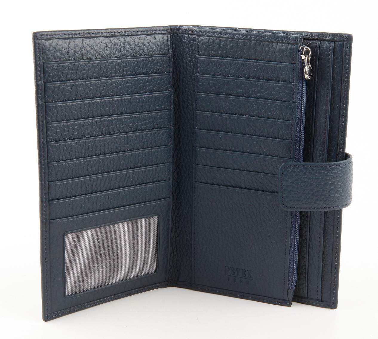 Современное удобное мужское портмоне Petek из натуральной кожи черного цвета с гладкой фактурой. Внутри имеются четыре кармана для купюр, отделение на молнии, 17 карманов для кредитных карт.