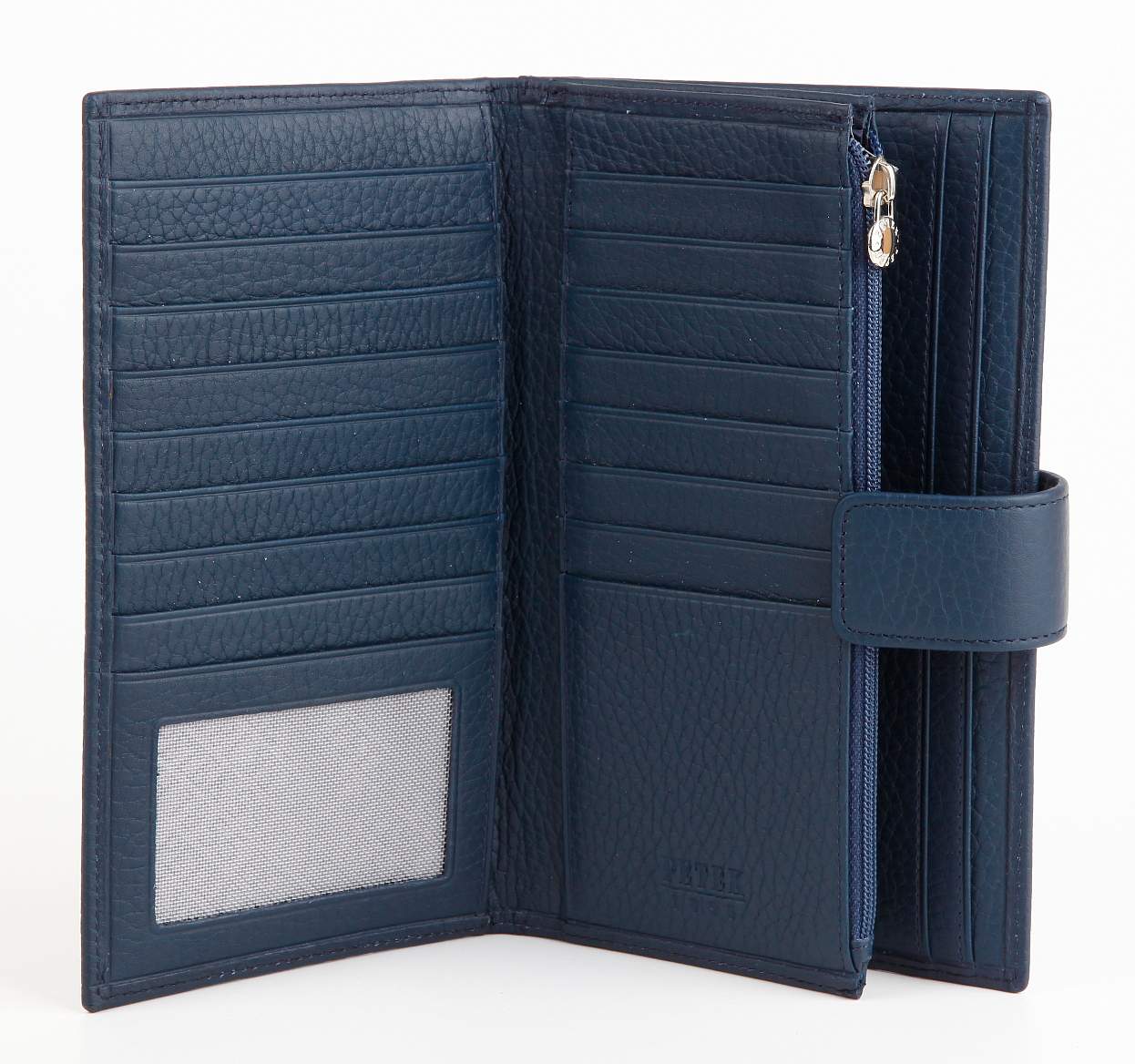 Современное удобное мужское портмоне Petek из натуральной кожи черного цвета с гладкой фактурой. Внутри имеются четыре кармана для купюр, отделение на молнии, 17 карманов для кредитных карт.