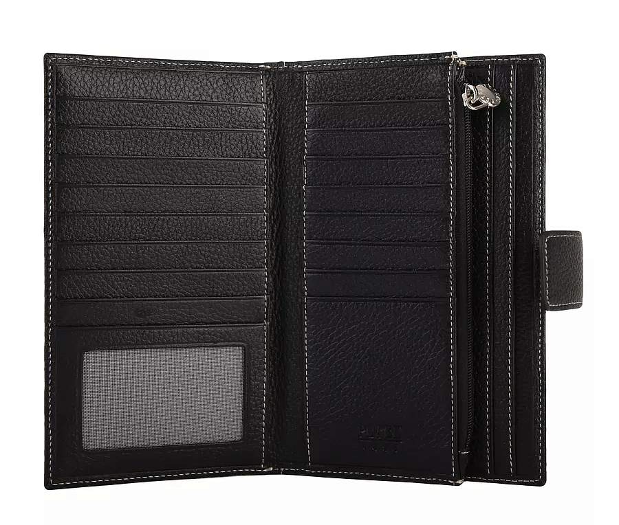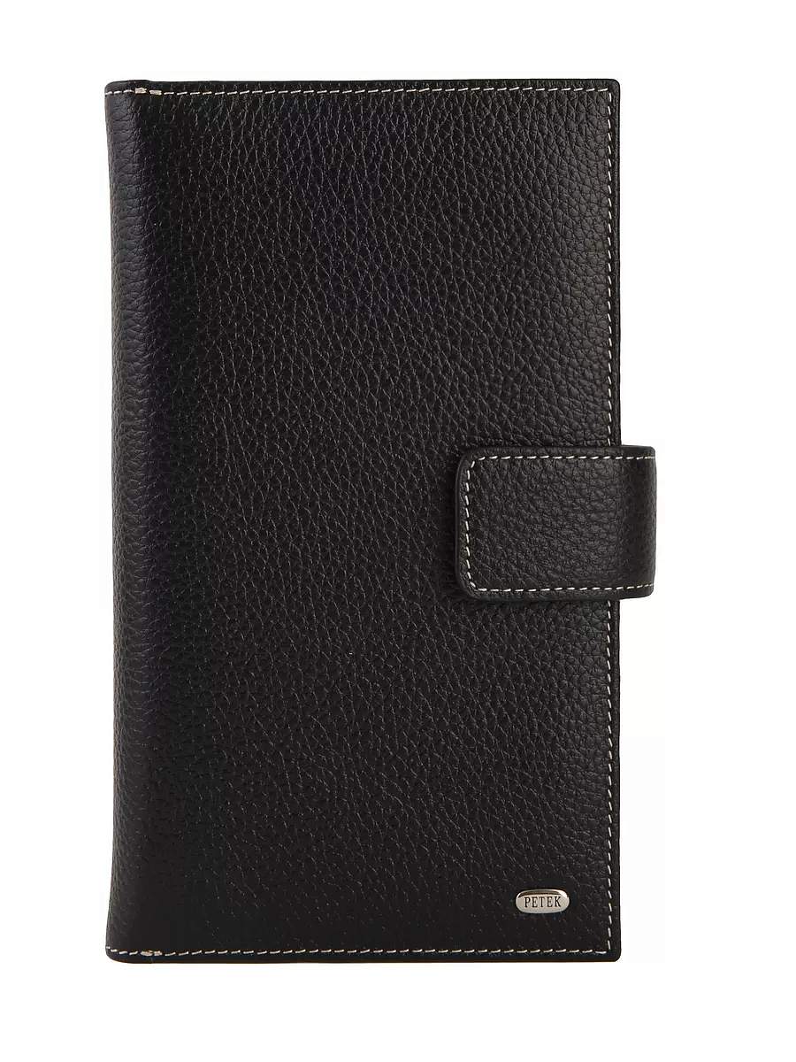 Современное удобное мужское портмоне Petek из натуральной кожи черного цвета с гладкой фактурой. Внутри имеются четыре кармана для купюр, отделение на молнии, 17 карманов для кредитных карт.