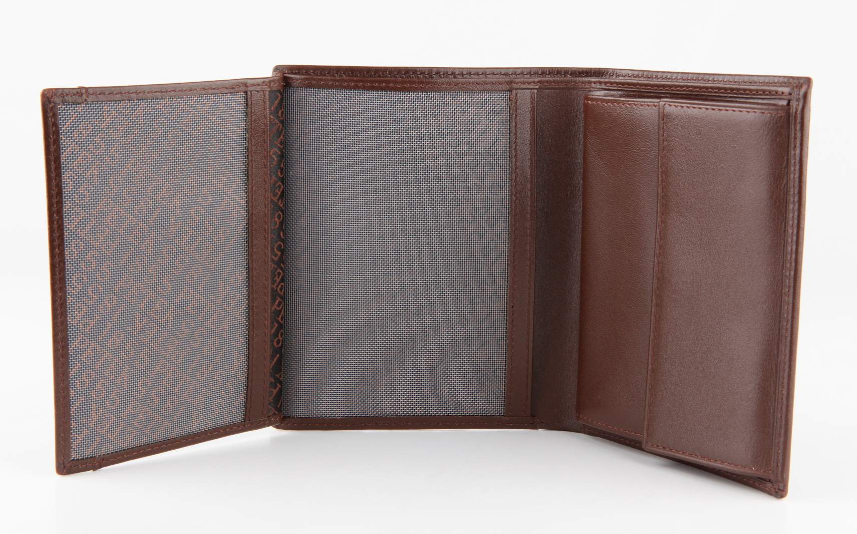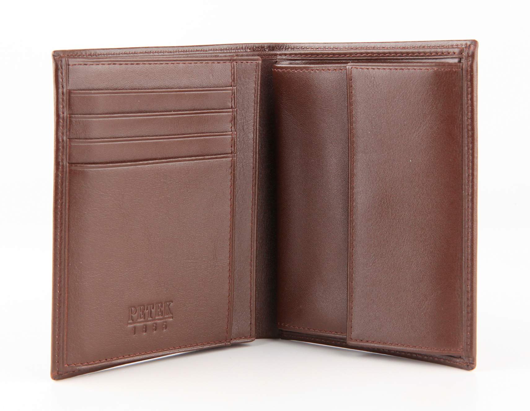 Мужское кожаное портмоне Petek. Закрывается без застежки. Отделение для купюр. Отделение для мелочи. 4 отделений для визитных и кредитных карт. 2 отделения для документов из сетки.