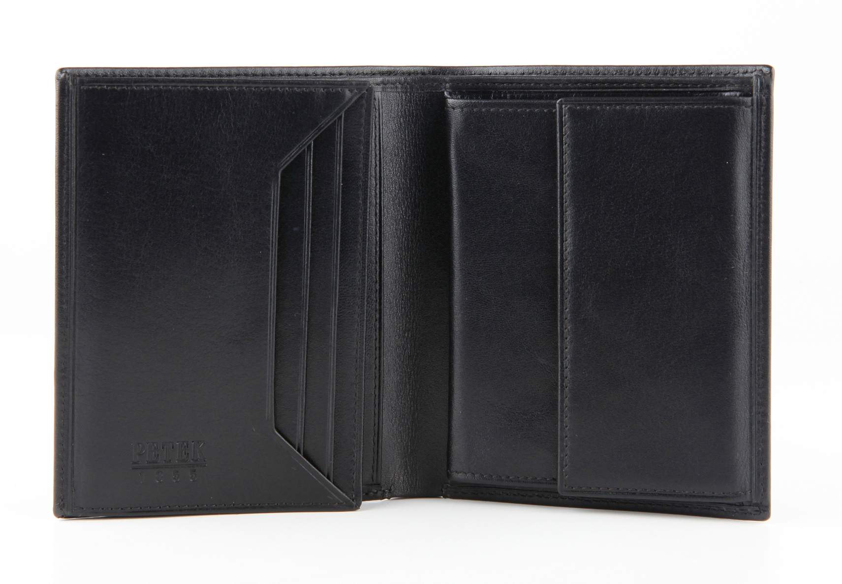 Мужское кожаное портмоне Petek. Портмоне без застежки: 2 отделения для купюр, монетница на кнопке, 5 кармашков для кредтных и скидочных карт, 2 отделения с окошком-сеточкой.