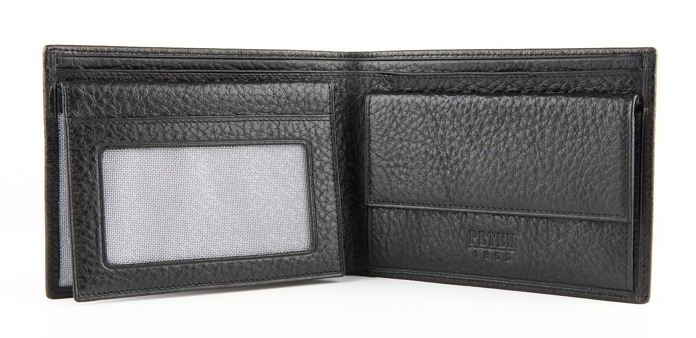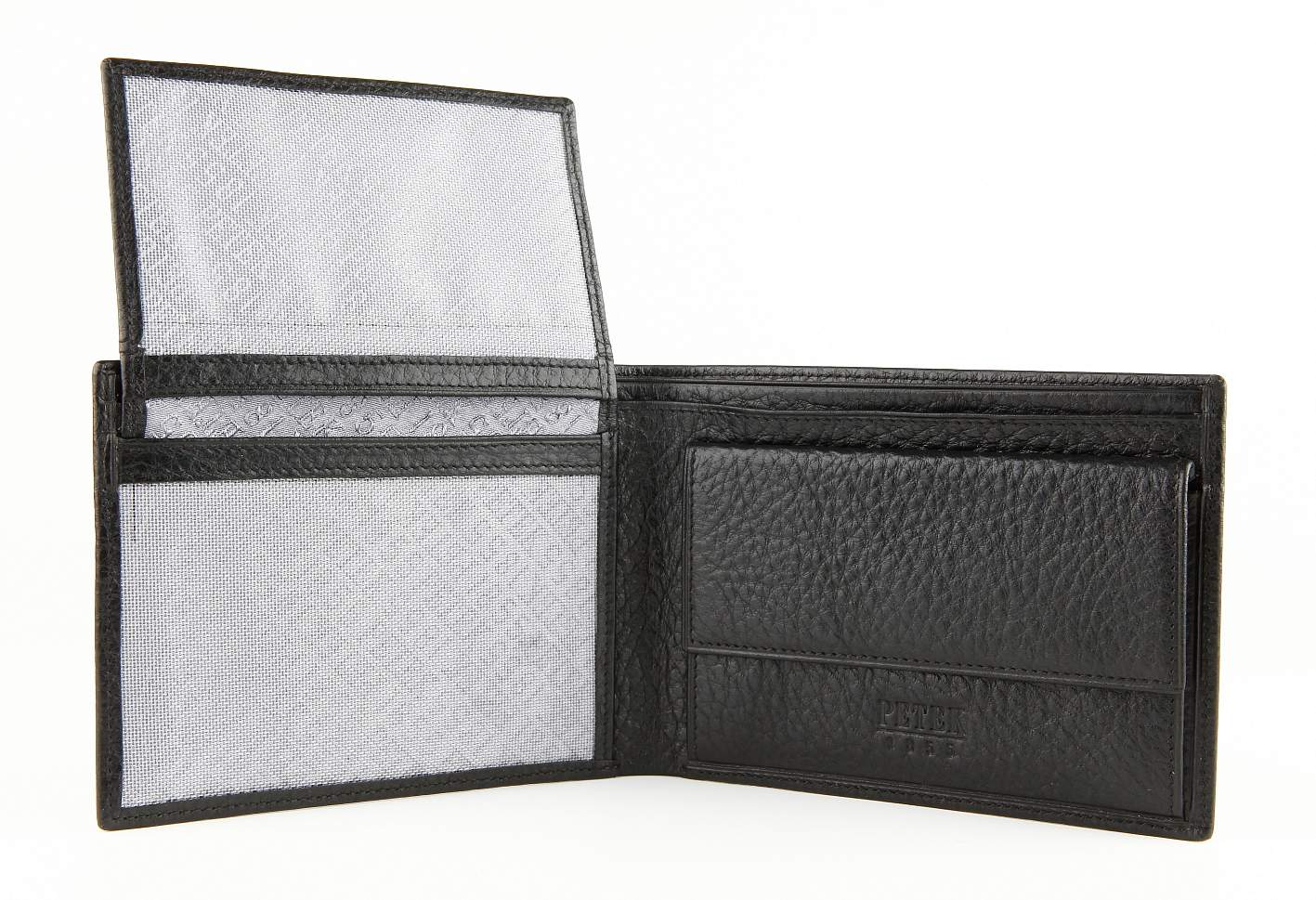 Стильное портмоне из натуральной кожи. Раскладывается пополам горизонтально, внутри: два отдела для купюр, отделение для мелочи, потайной карман для документов, два кармана для документов в сеточку, один кармашек для документа или пластиковой карты в сеточку.