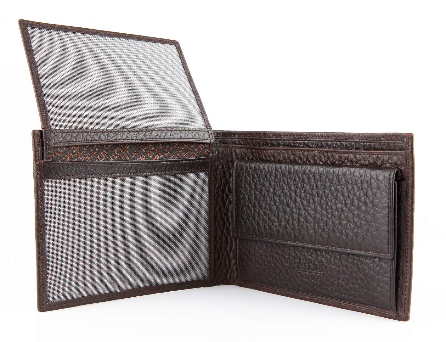 Стильное портмоне из натуральной кожи. Раскладывается пополам горизонтально, внутри: два отдела для купюр, отделение для мелочи, потайной карман для документов, два кармана для документов в сеточку, один кармашек для документа или пластиковой карты в сеточку.