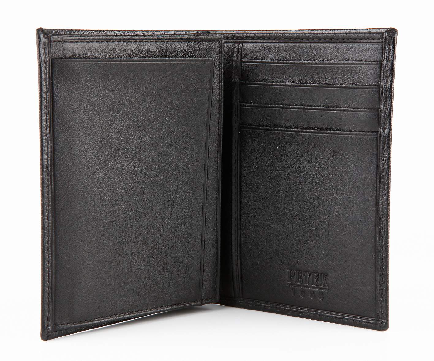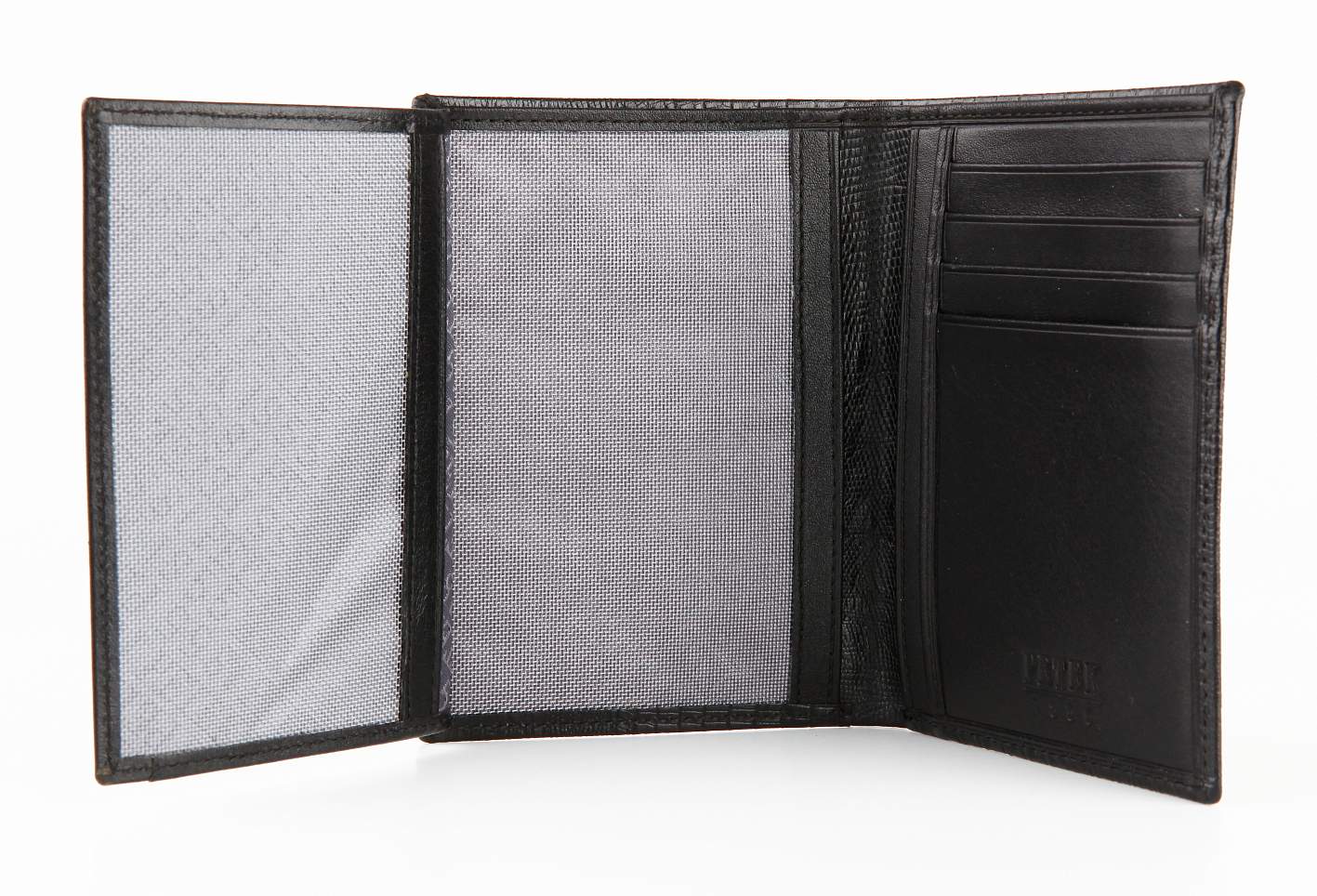 Элегантное портмоне из натуральной кожи. Раскладывается пополам. Внутри: большой отдел для купюр, два потайных кармана для документов, два кармана для документов в сеточку, кармашек с отгибающимся уголком для документа (пропуска), четыре кармашка для пластиковых карт.