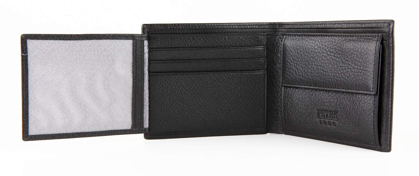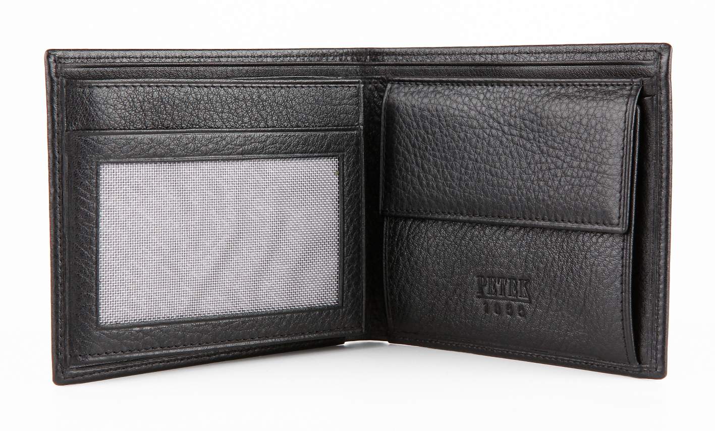 Портмоне. Раскладывается пополам. Внутри: два отдела для купюр, один потайной карман для документов, два кармана для документов в сеточку, три кармашка для пластиковых карт.