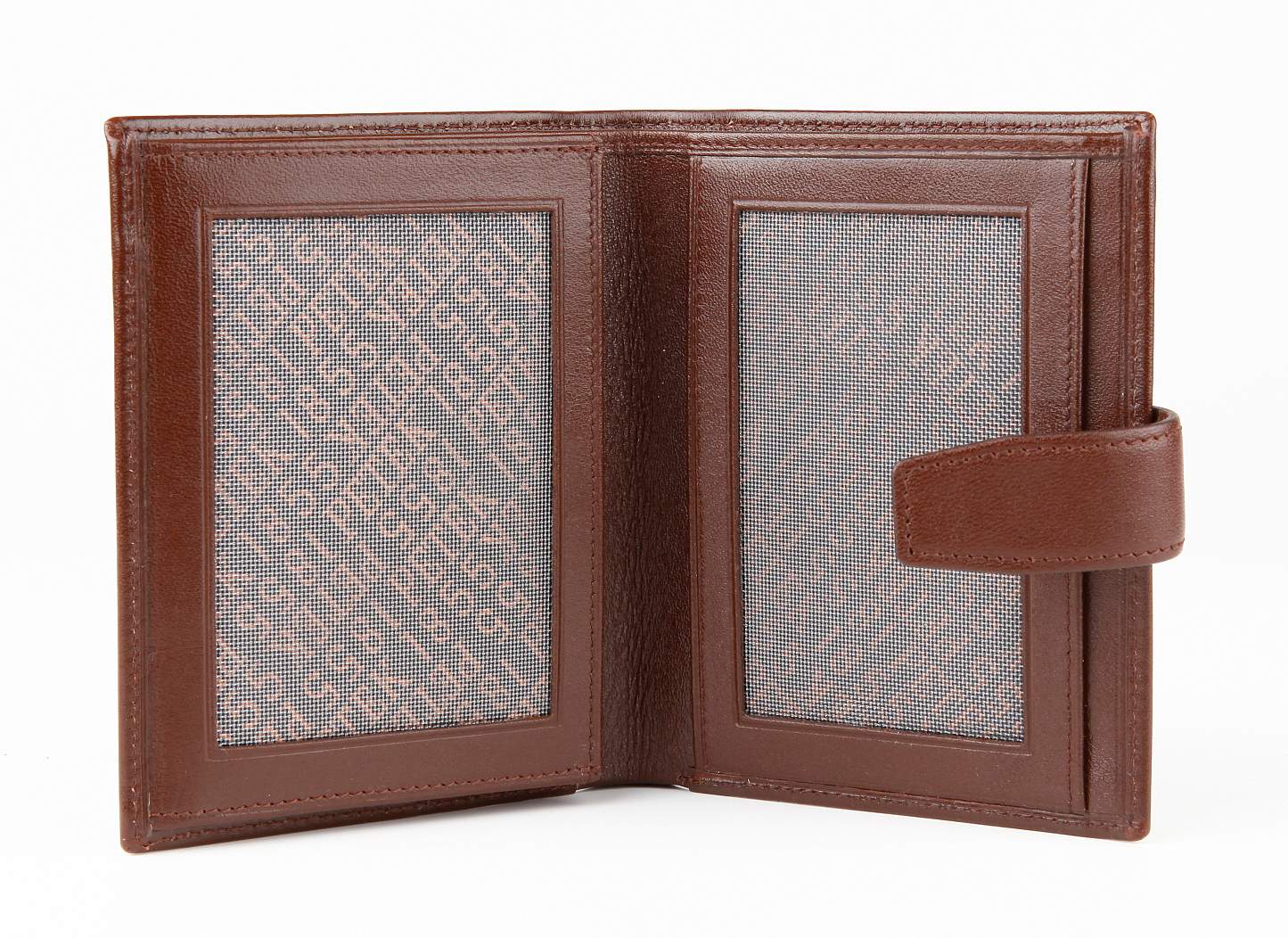 Закрывается хлястиком на кнопке 2 отделения для купюр, 5 отделений для визитных и кредитных карт, 2 многофункциональных отделения, 2 отделения для документов из сетки.