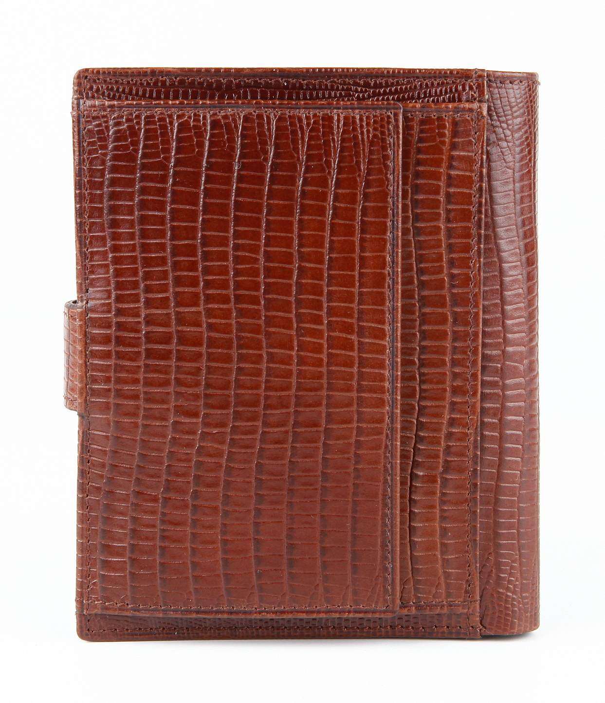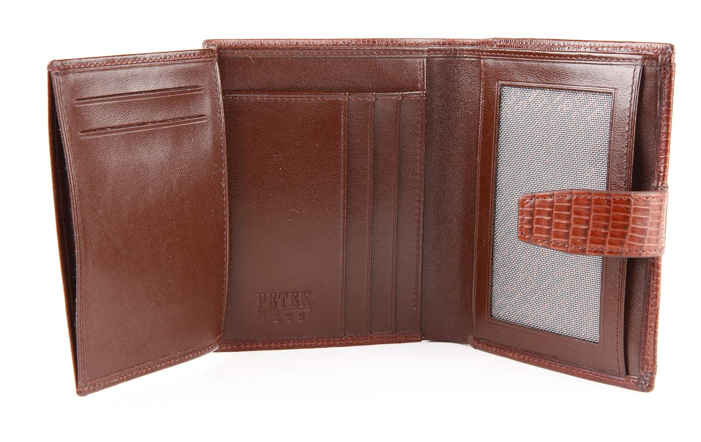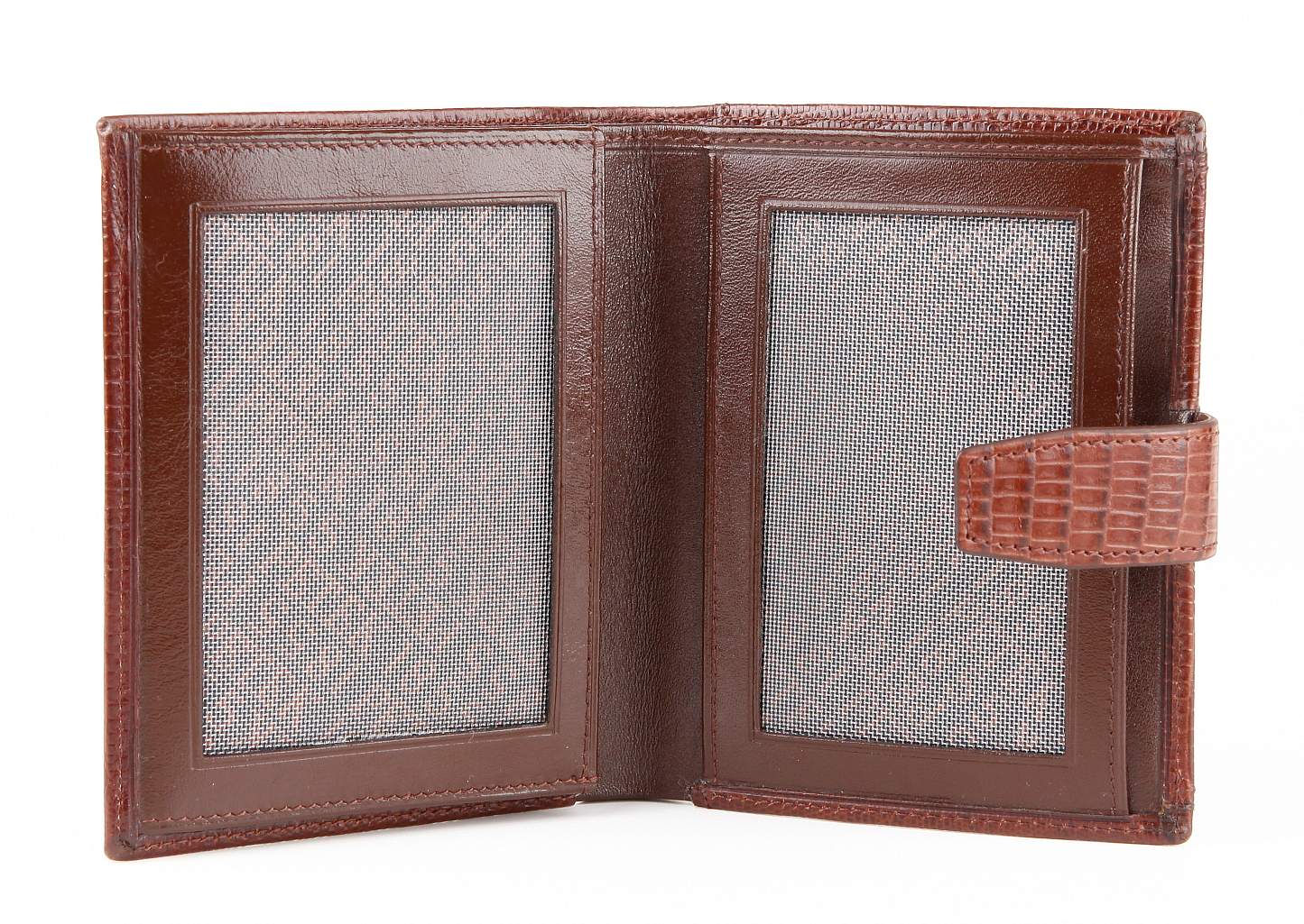 В этой модели предусмотрены два вместительных отделения для купюр. Открыв портмоне, Вы сразу получаете доступ к двум отделениям для документов из прозрачной черной сетки.  Слева, под откидным блоком имеются пять прорезных карманов для кредитных карточек. Имеются, также, четыре дополнительных кармана. Евро монетница, закрывающаяся на кнопку, вынесена на внешнюю заднюю стенку. Портмоне закрывается хлястиком на кнопку.