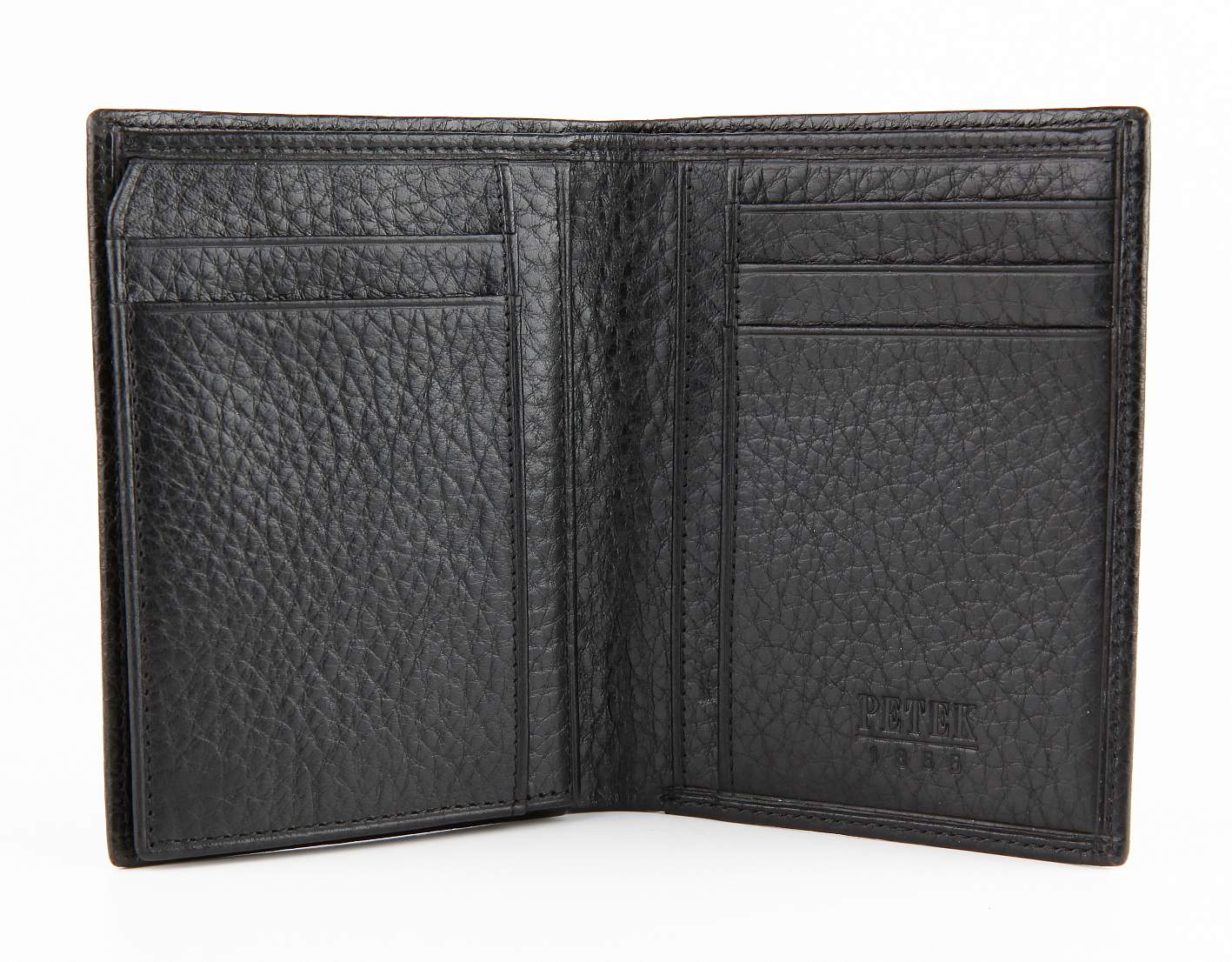 Мужское портмоне Petek из натуральной кожи. Закрывается без застежки. 2 отделения для купюр. 5 отделений для визитных и кредитных карт. 2 многофункциональных отделения. 2 отделения для документов из сетки.