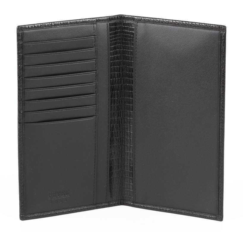 Данная модель большого размера и выглядит очень элегантно и со вкусом. Подойдет как обычное, так и как дорожное портмоне, подходит в качестве универсального чехла для смартфона. В нем находятся три  длинных отделения для купюр различной валюты и восемь карманов для кредитных и дисконтных карт.