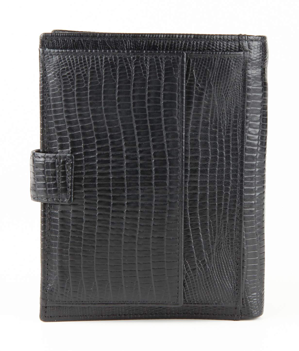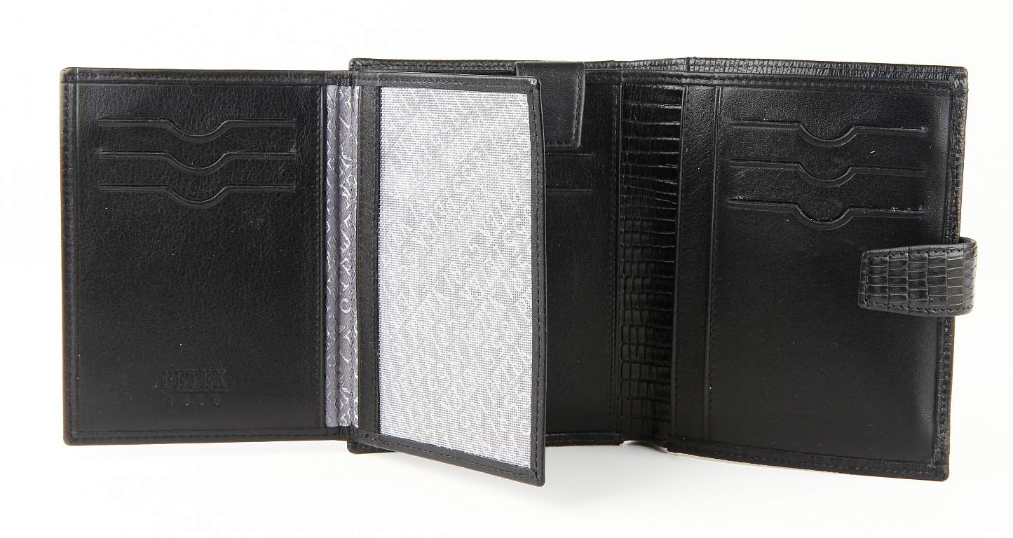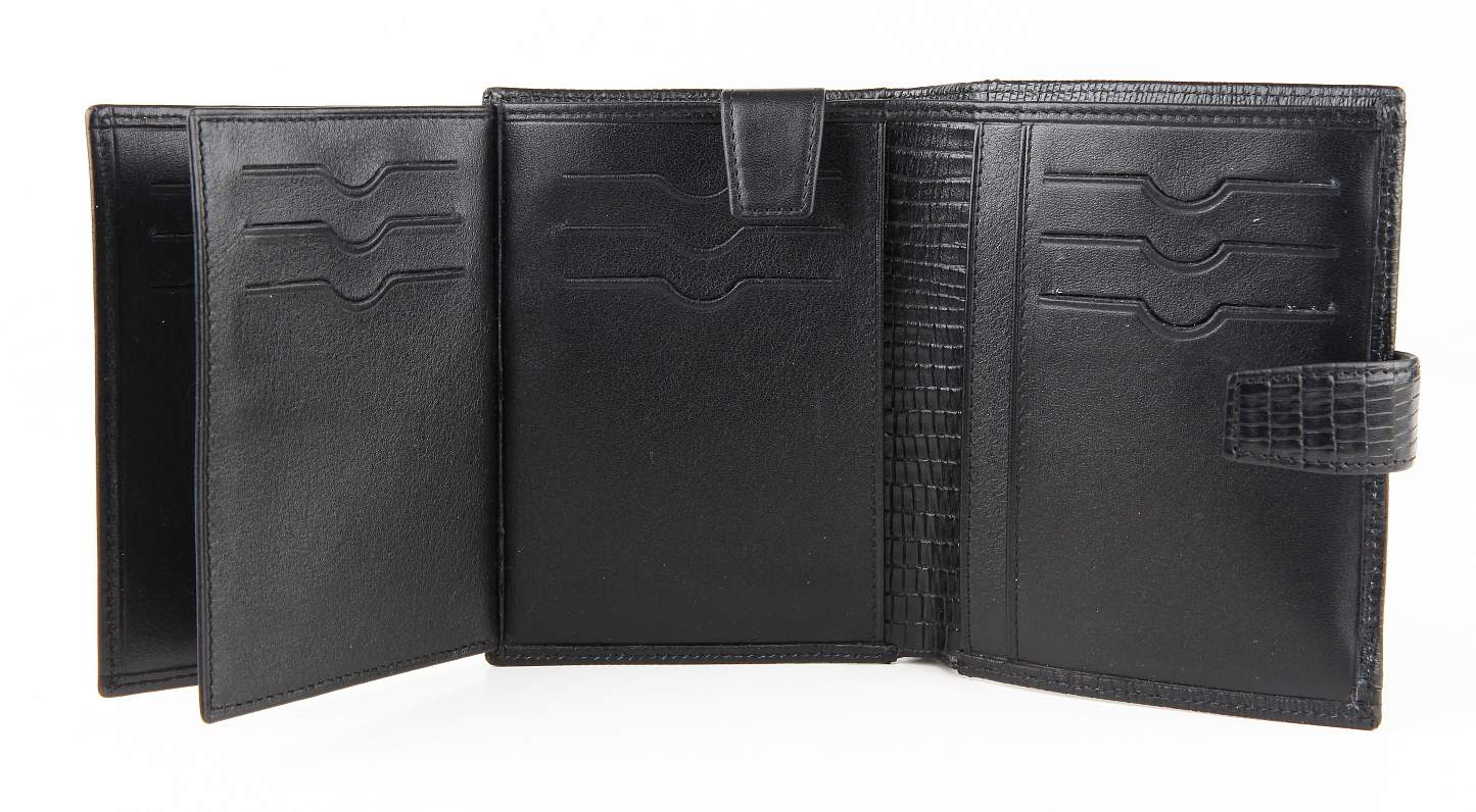 Закрывается хлястиком на кнопке. 2 отделения для купюр. Отделение для мелочи. 9 отделений для визитных и кредитных карт. 2 многофункциональных отделения. 2 отделения для документов из сетки.