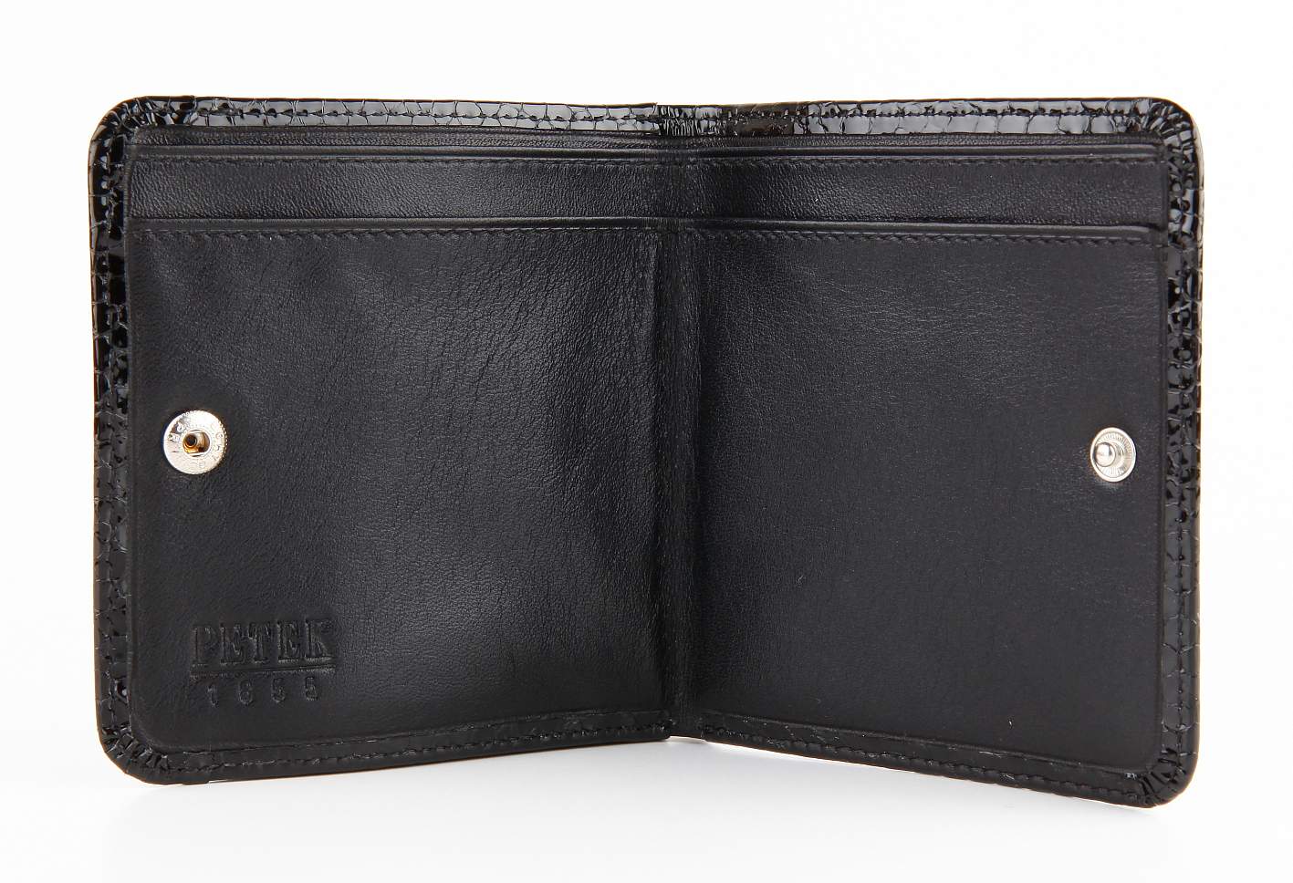 Мужское портмоне Petek из натуральной кожи. Компактная небольшая модель, которая легко поместится в карман пиджака или брюк. Внутри: два отделения для купюр, отделение для монет. Портмоне закрывается на кнопку.