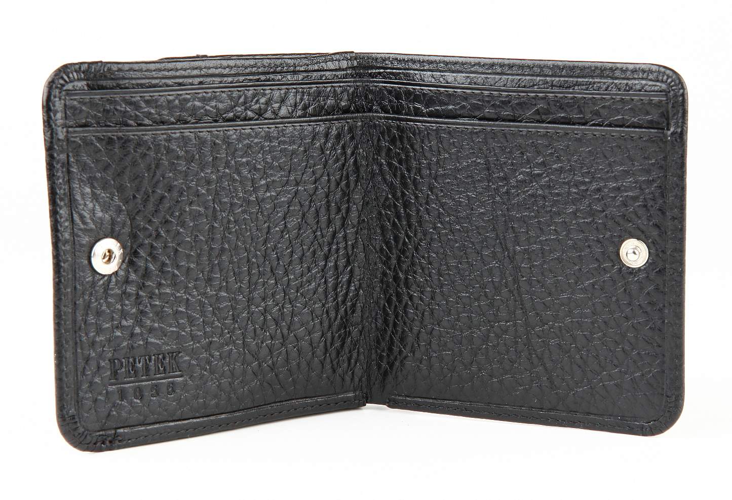 Мужское портмоне Petek из натуральной кожи. Компактная небольшая модель, которая легко поместится в карман пиджака или брюк. Внутри: два отделения для купюр, отделение для монет. Портмоне закрывается на кнопку.