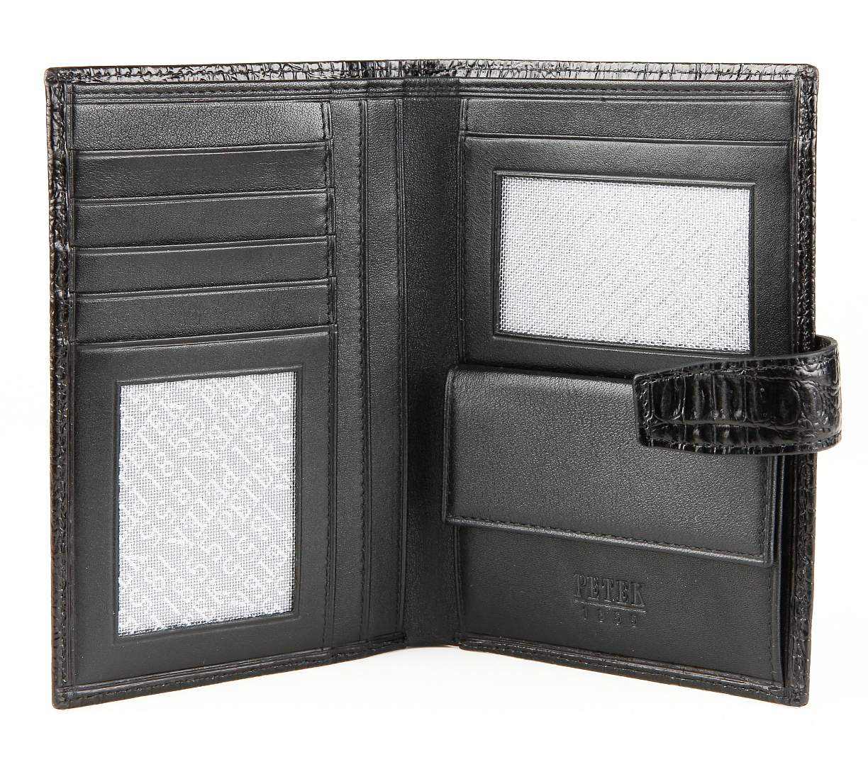 Портмоне из натуральной кожи. Внутри: два отделения для купюр, монетница, прозрачное окошко, четыре боковых кармана и пять отделений для визитных или пластиковых карт.