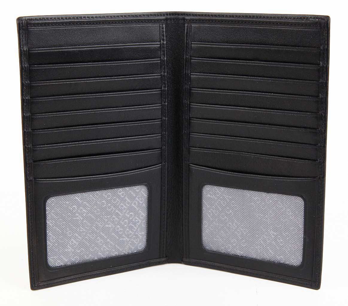 Портмоне из натуральной кожи. Модель для тех, кто пользуется кредитными карточками чаще, чем купюрами. Внутри двадцать отделений для кредиток, десять слева и десять справа. Под ними прозрачные карманы(слева с пластиковым окошком, справа с сеткой). Сверху большой карман для наличности с фактурной и крепкой подкладкой. В комплекте брошюра о компании и гарантия производителя. Характеристики товара: Отделения для купюр — 1, закрывается — без застёжки Отделения для карточек — 20  Внутренние отделения — 2