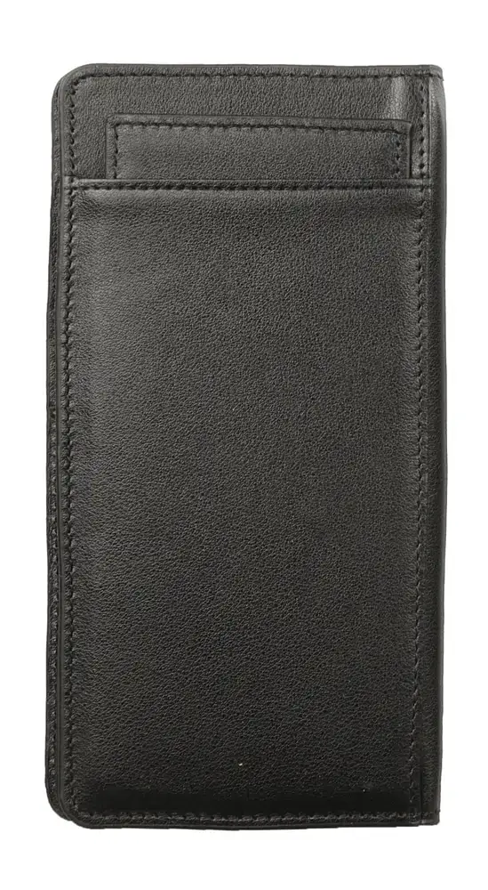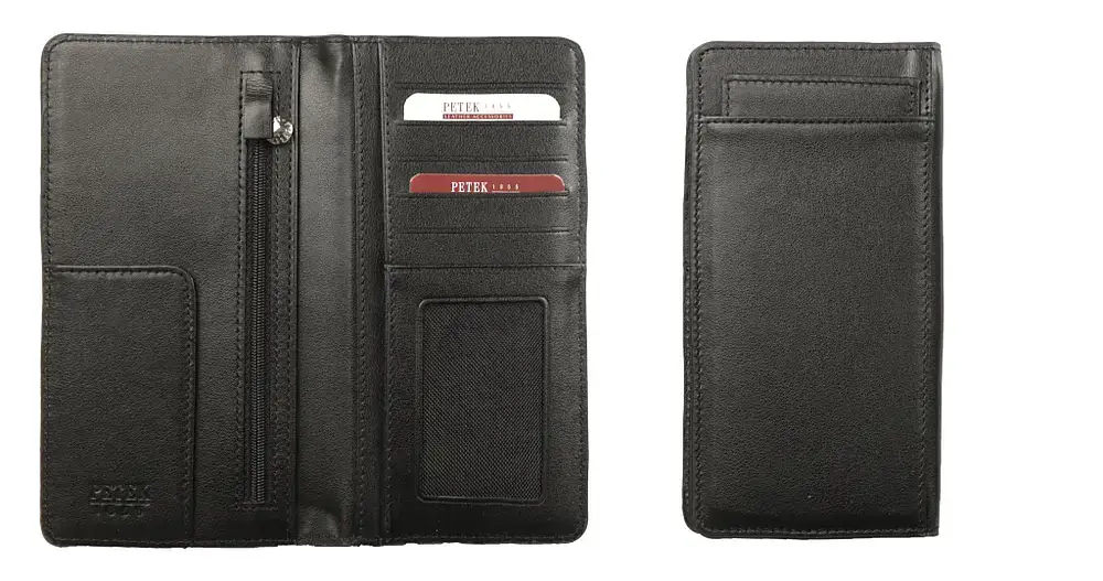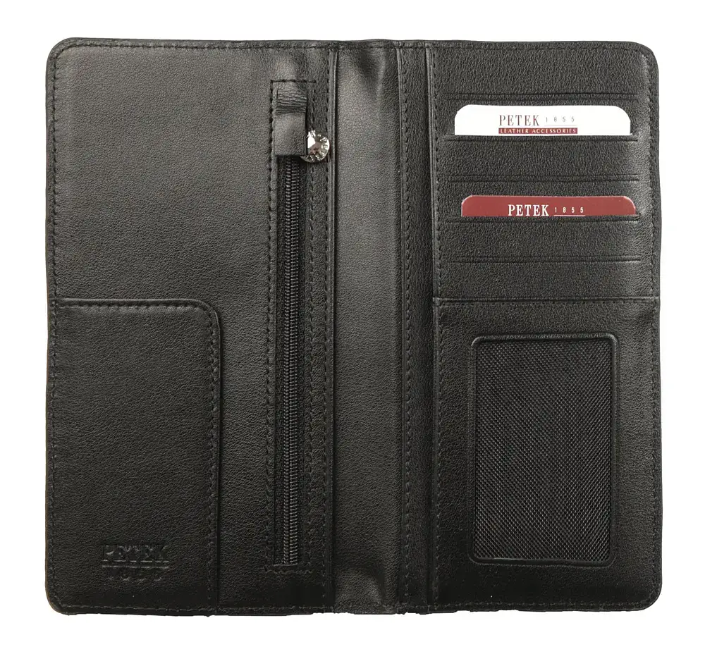 Портмоне из натуральной телячьей кожи от бренда Petek 1855. В изделии предусмотрен карман для заметок, карман на молнии, шесть карманов для кредитных карт, один из которых с сетчатой структурой, и три отделения для банкнот. С обратной стороны расположен карман со съёмным отделением, содержащим пять карманов для карт. Произведено в Турции.