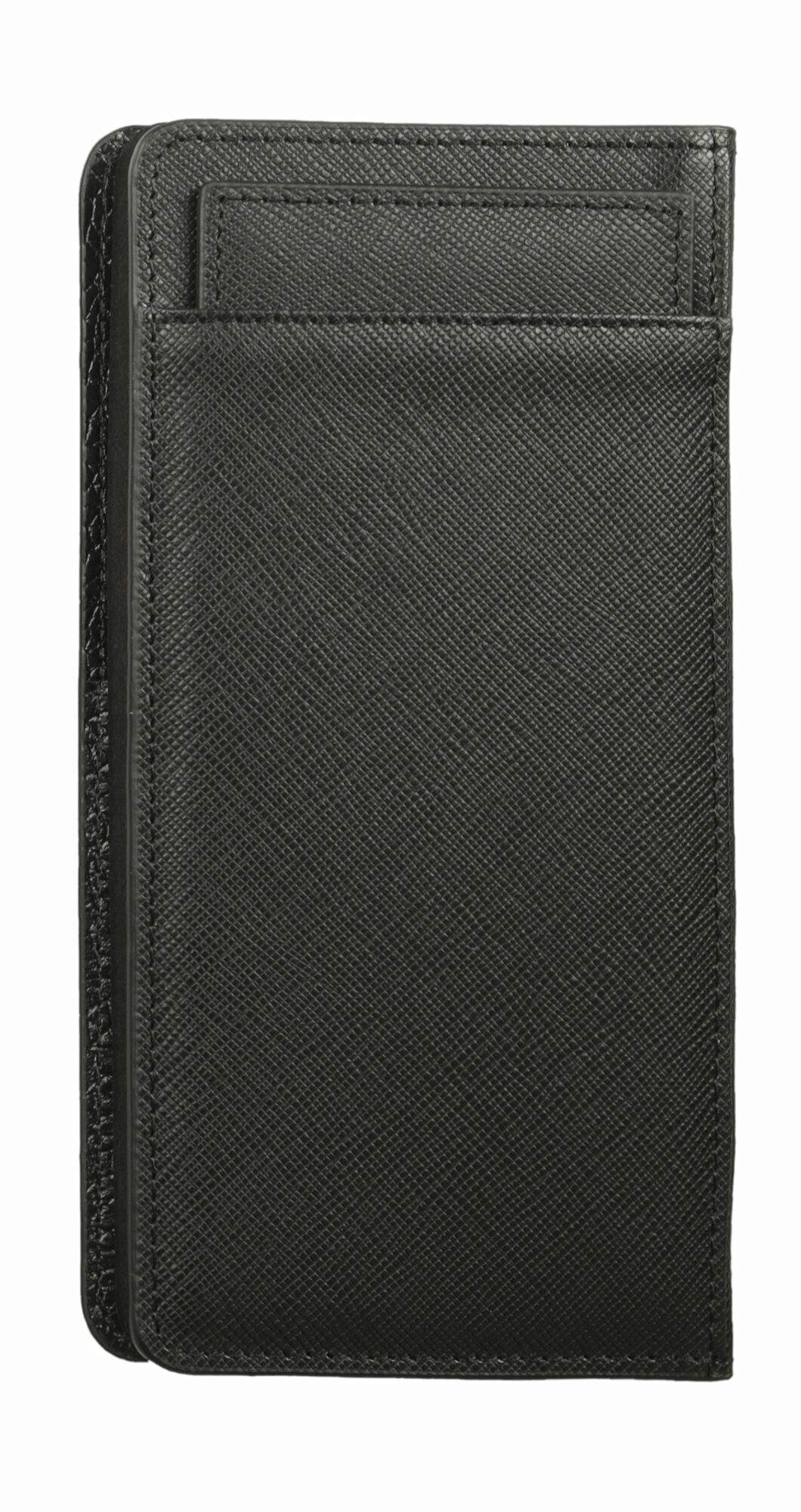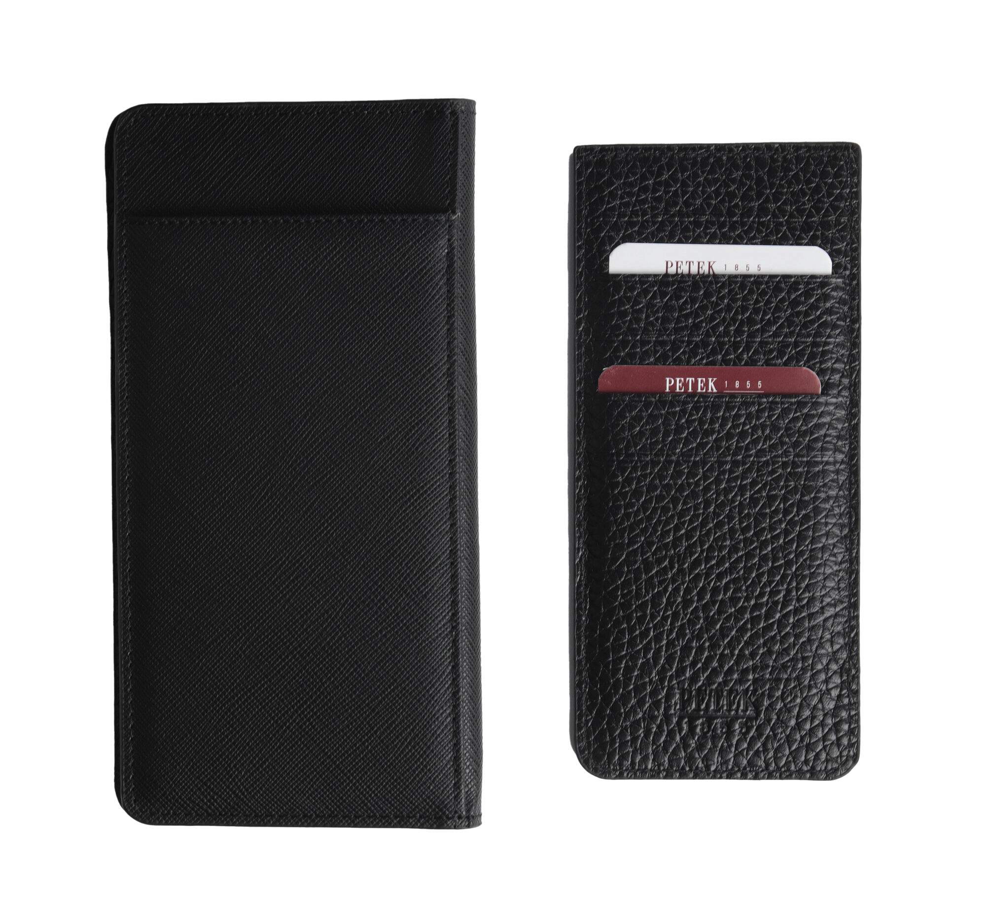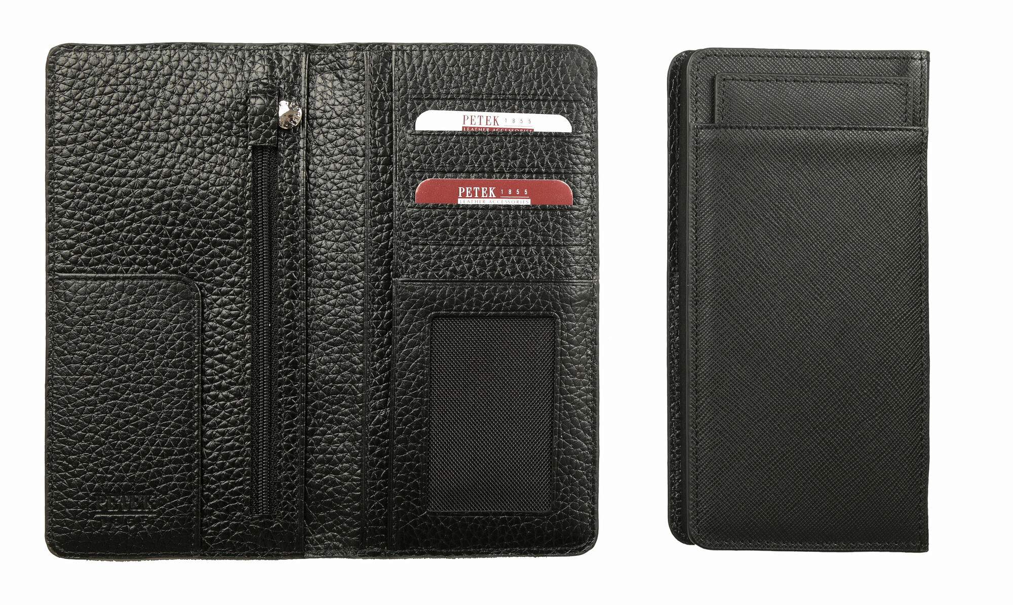 Портмоне из натуральной телячьей кожи от бренда Petek 1855. В изделии предусмотрен карман для заметок, карман на молнии, шесть карманов для кредитных карт, один из которых с сетчатой структурой, и три отделения для банкнот. С обратной стороны расположен карман со съёмным отделением, содержащим пять карманов для карт. Произведено в Турции.