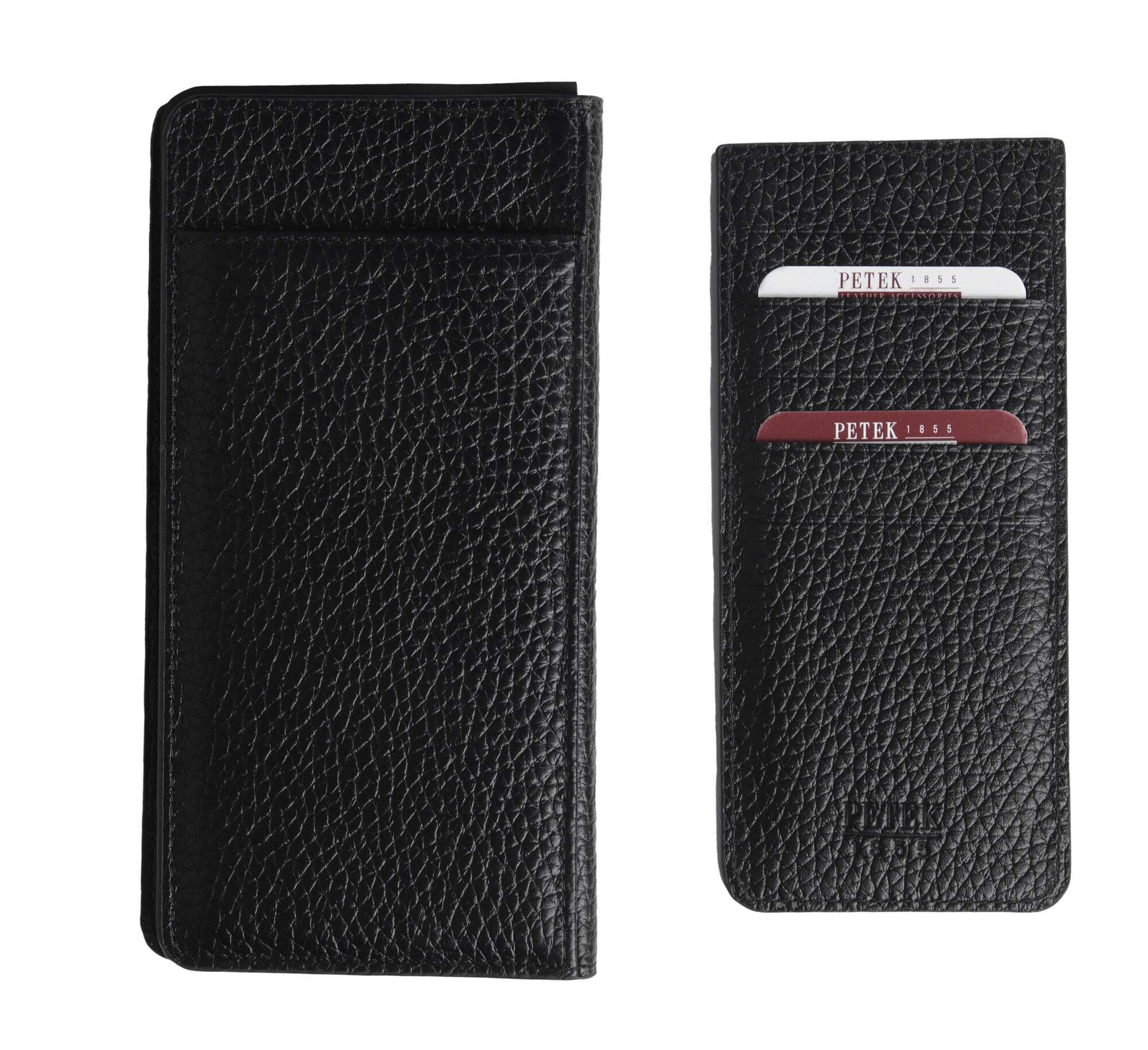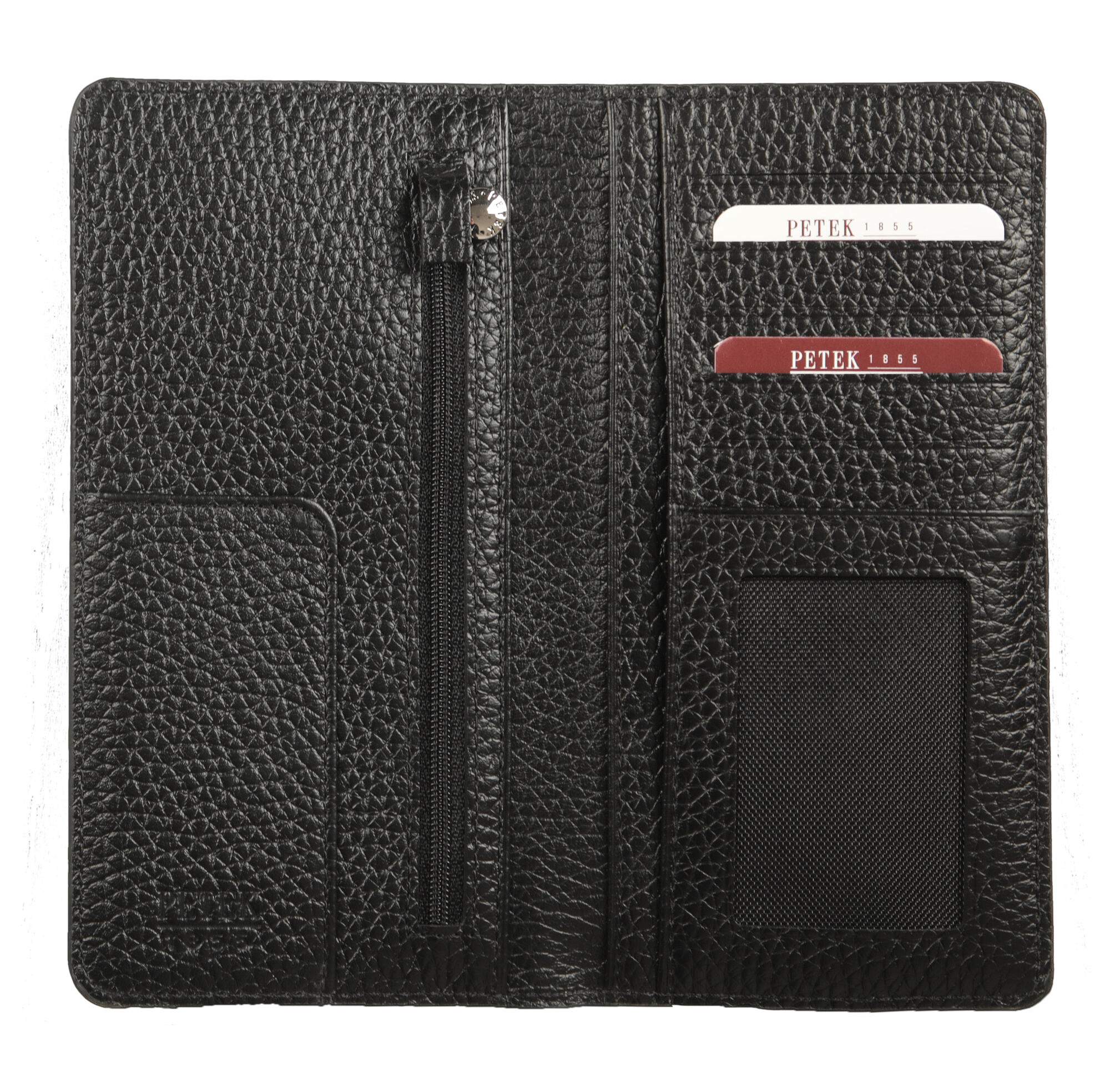 Портмоне из натуральной телячьей кожи от бренда Petek 1855. В изделии предусмотрен карман для заметок, карман на молнии, шесть карманов для кредитных карт, один из которых с сетчатой структурой, и три отделения для банкнот. С обратной стороны расположен карман со съёмным отделением, содержащим пять карманов для карт. Произведено в Турции.