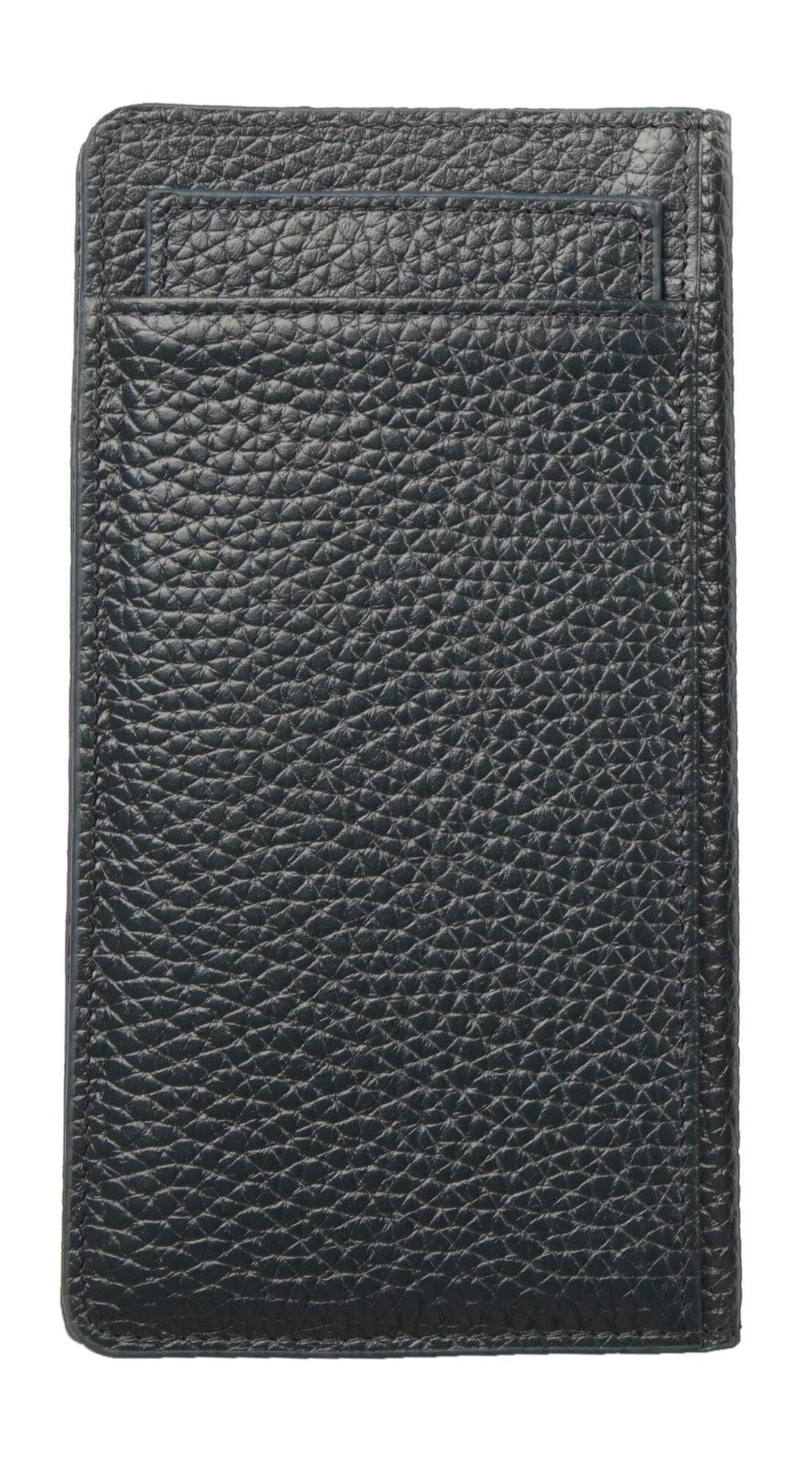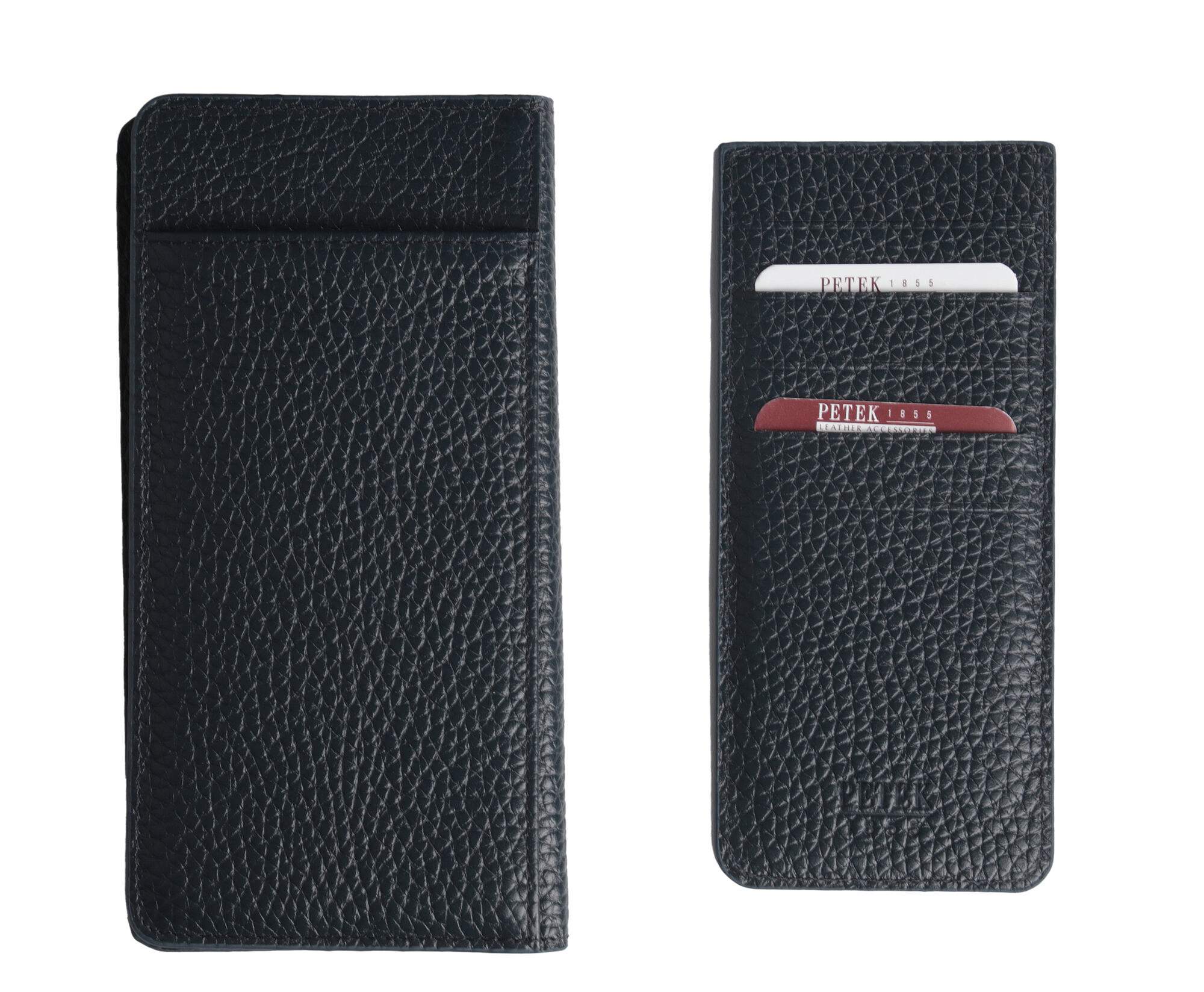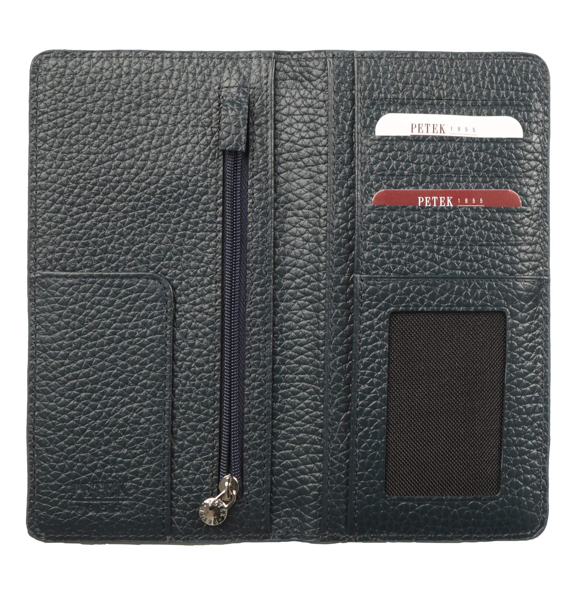 Портмоне из натуральной телячьей кожи от бренда Petek 1855. В изделии предусмотрен карман для заметок, карман на молнии, шесть карманов для кредитных карт, один из которых с сетчатой структурой, и три отделения для банкнот. С обратной стороны расположен карман со съёмным отделением, содержащим пять карманов для карт. Произведено в Турции.