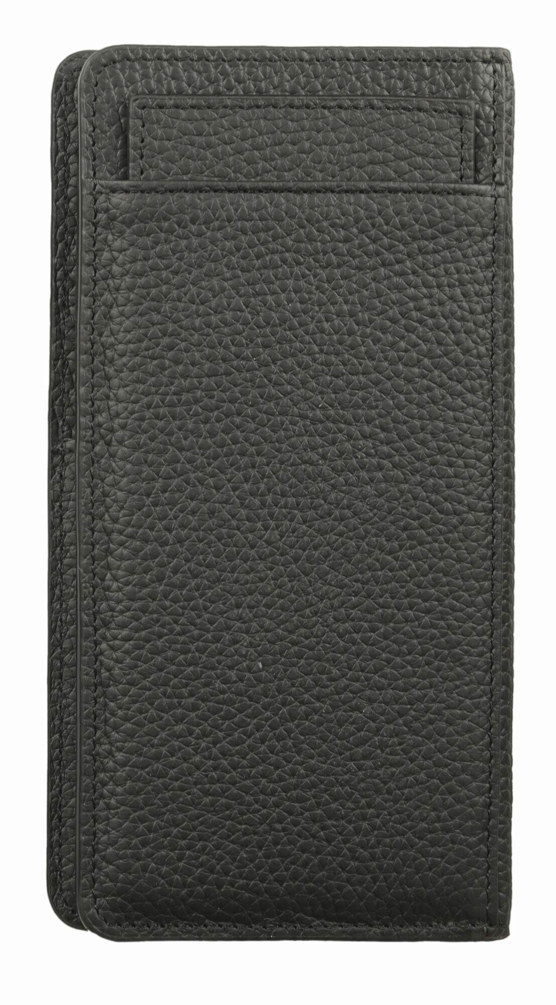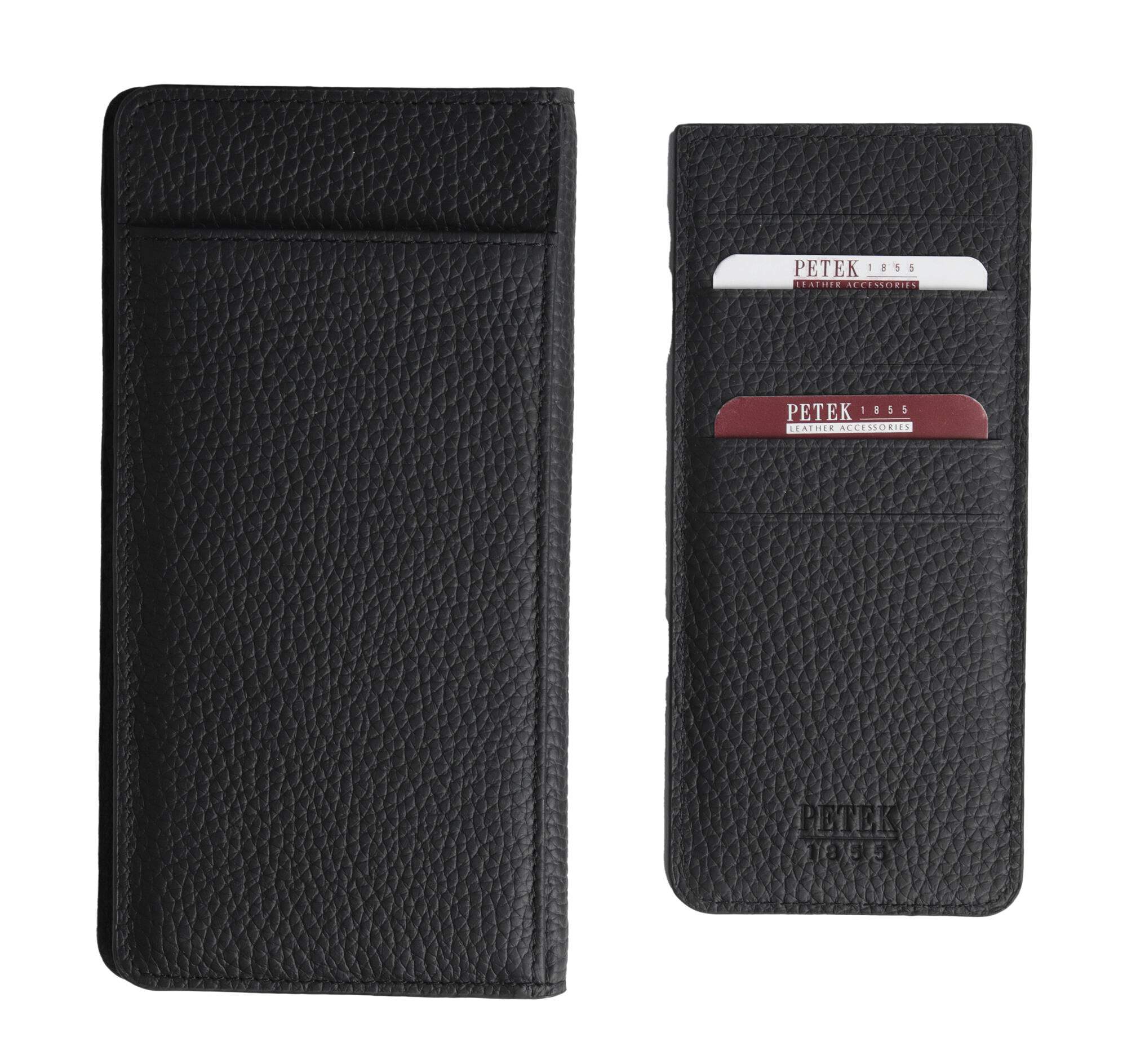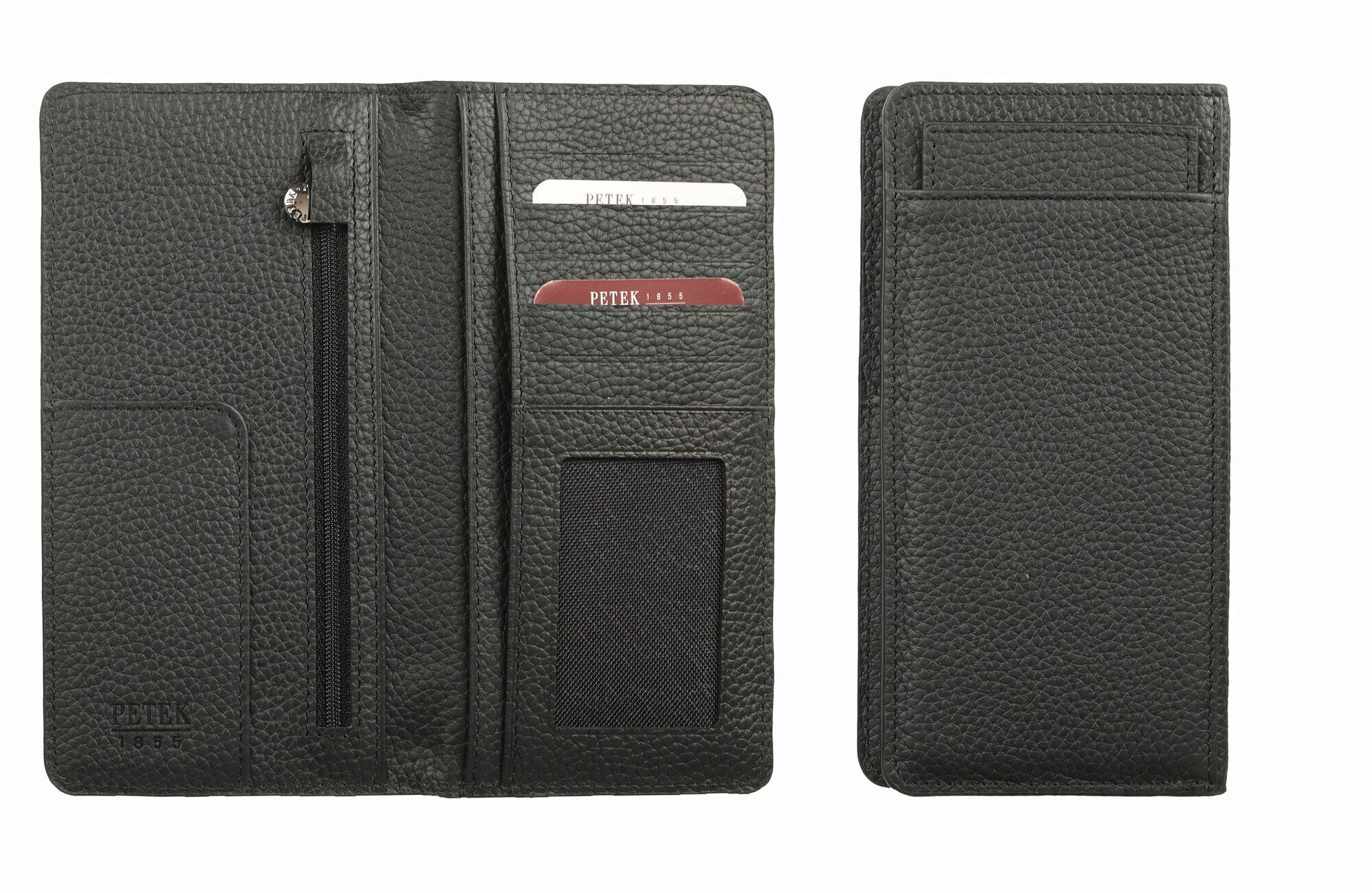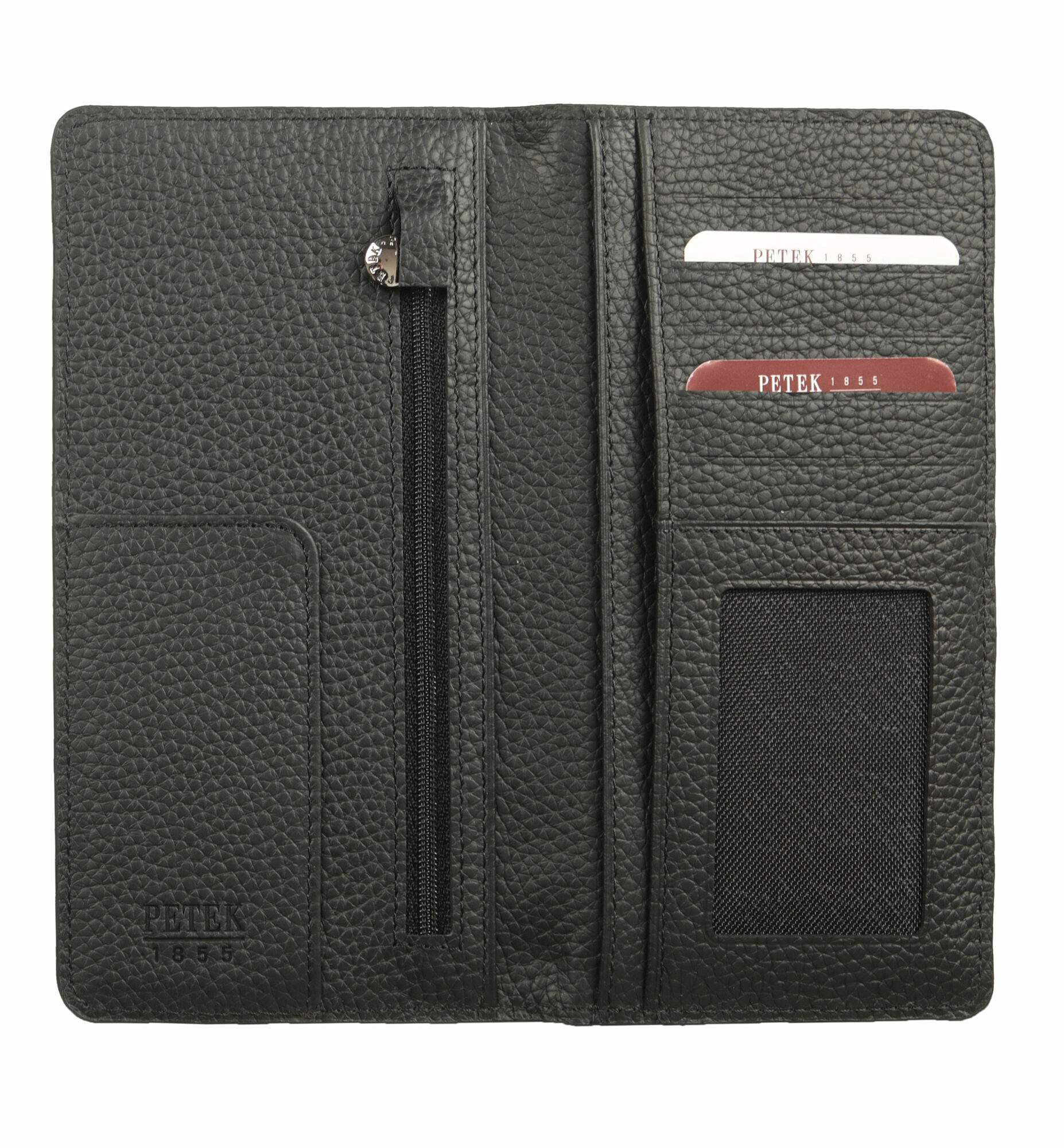 Портмоне из натуральной телячьей кожи от бренда Petek 1855. В изделии предусмотрен карман для заметок, карман на молнии, шесть карманов для кредитных карт, один из которых с сетчатой структурой, и три отделения для банкнот. С обратной стороны расположен карман со съёмным отделением, содержащим пять карманов для карт. Произведено в Турции.