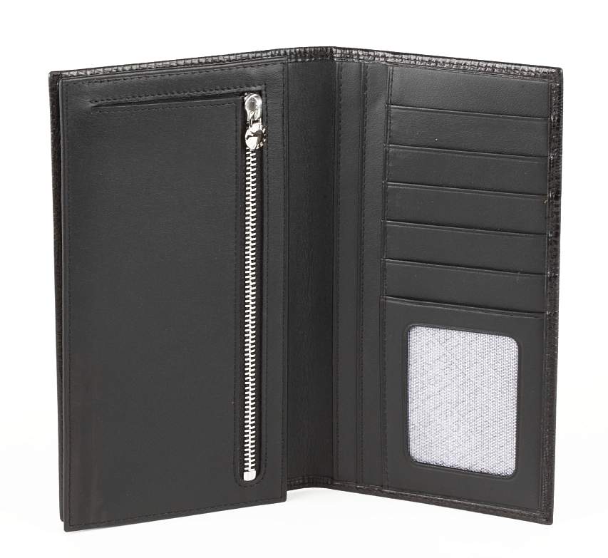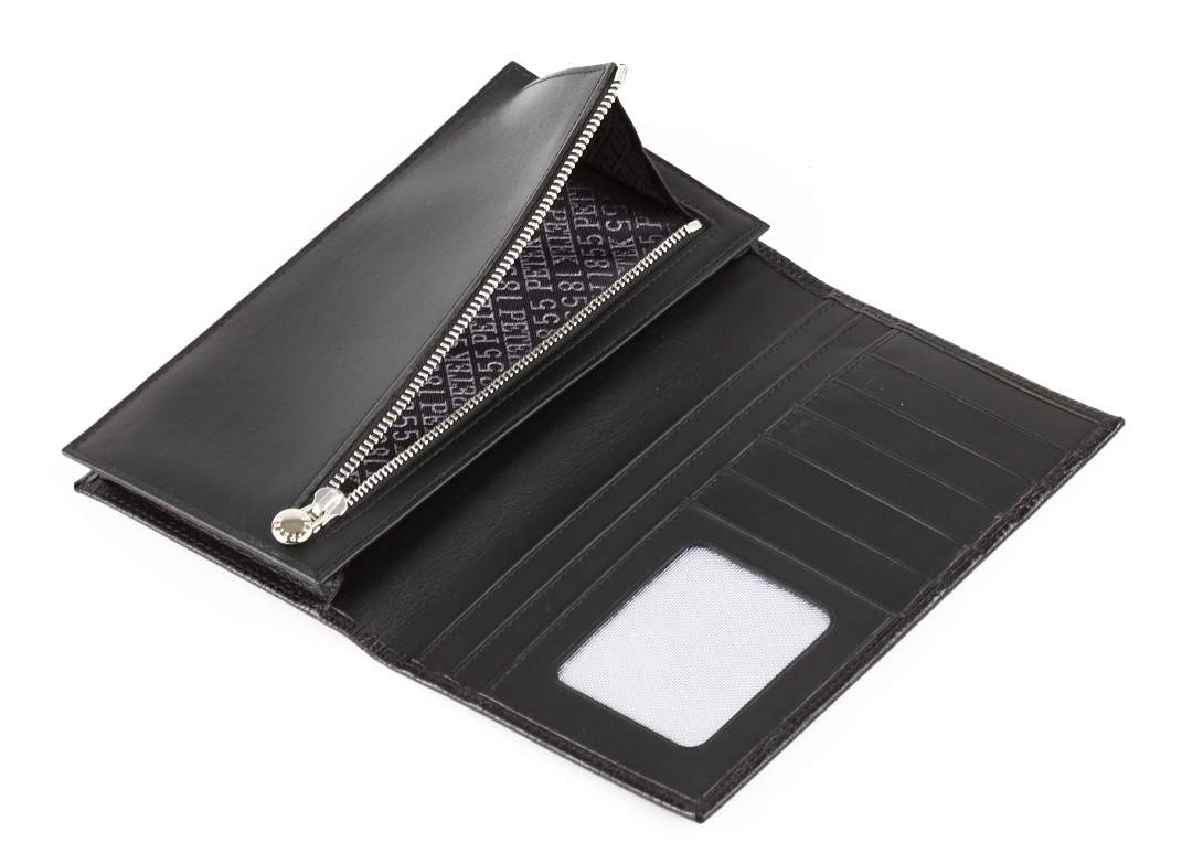 Мужской бумажник из натуральной телячьей кожи. Современная и стильная модель из фактурной кожи. Это портмоне большого размера для удобного хранения всего необходимого.Внутри большой и вместительный карман для купюр или документов с фирменной подкладкой PETEK 1855. Предусмотрено пять прорезных карманов для кредитных или визитных карточек, карман с сеточкой и потайные карманы, монетница на молнии