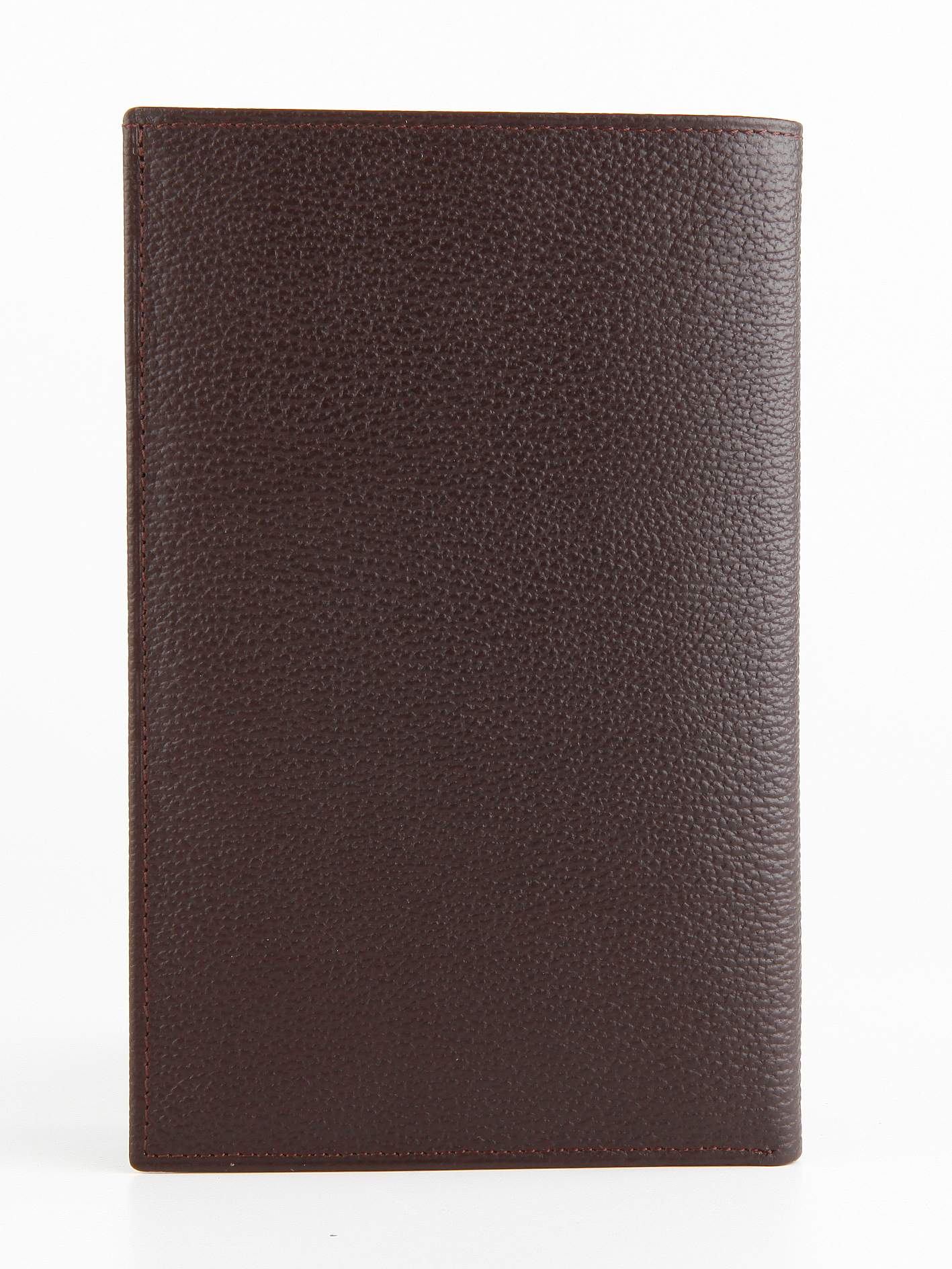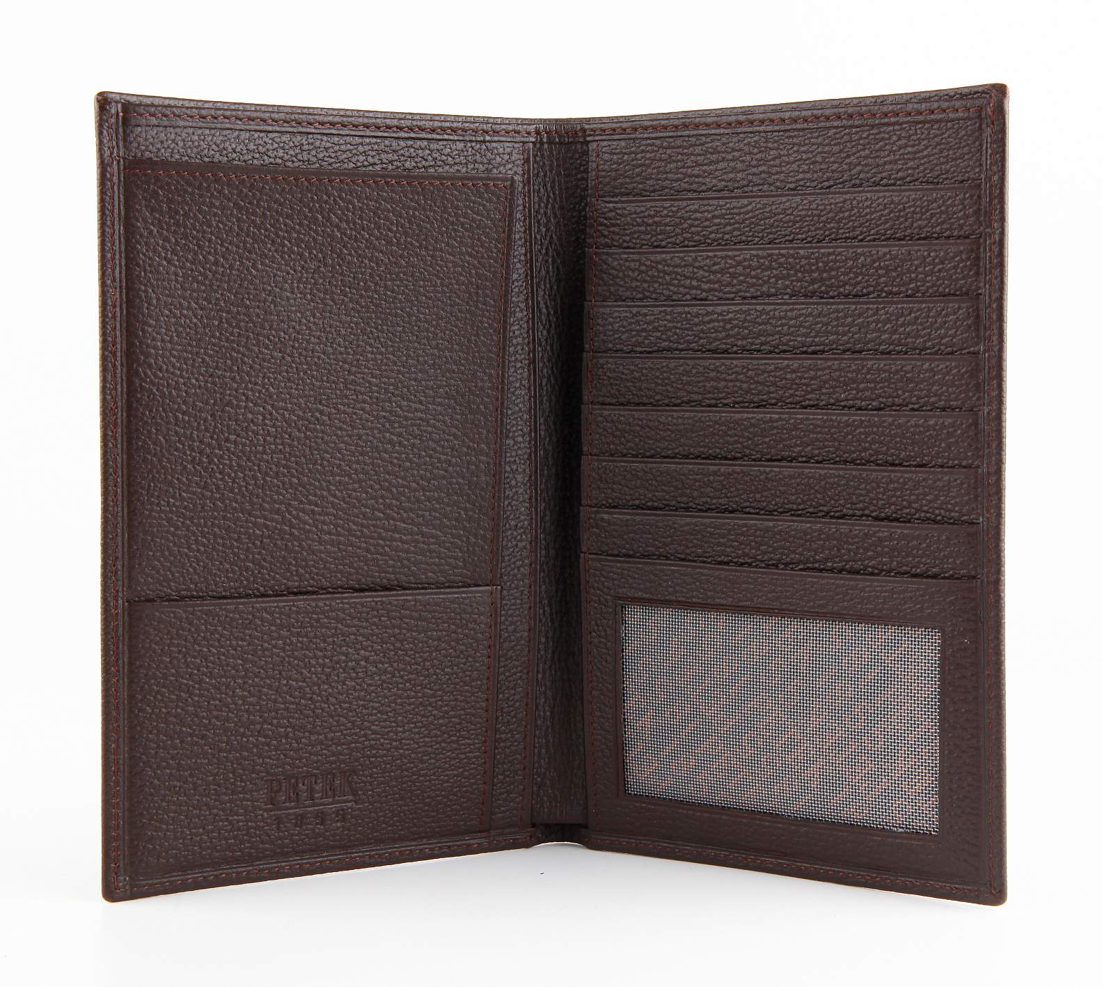 Бумажник путешественника из натуральной телячьей кожи. Внутри расположено место для паспорта, большой отдел для визитных и кредитных карт, одно отделение с прозрачным окошком, плюс один маленький карман и просторное отделение для наличных денег.